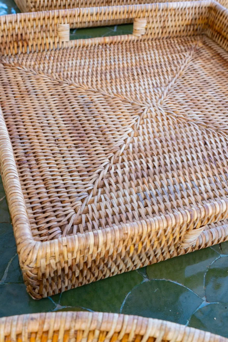 Bandeja cuadrada de ratán con asas, ideal para servir con estilo, organizar tu espacio o como elemento decorativo. Esta colección combina la belleza del material natural con la funcionalidad y el diseño contemporáneo.