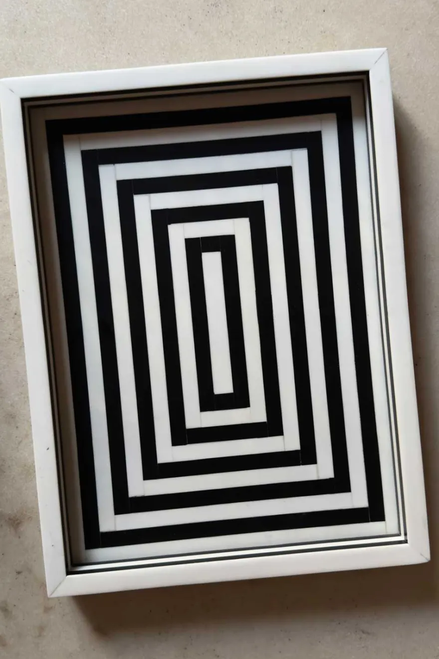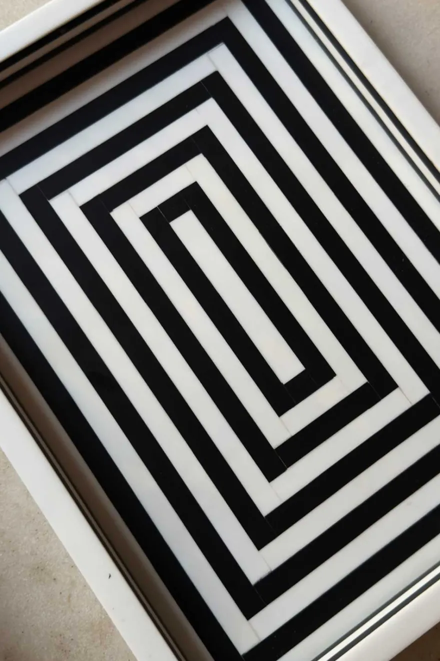 Bandeja rectangular elaborada en resina, con un elegante diseño de rayas blancas y negras que aporta un estilo moderno y sofisticado. Elaborada con patrones únicos y fabricada de manera artesanal.