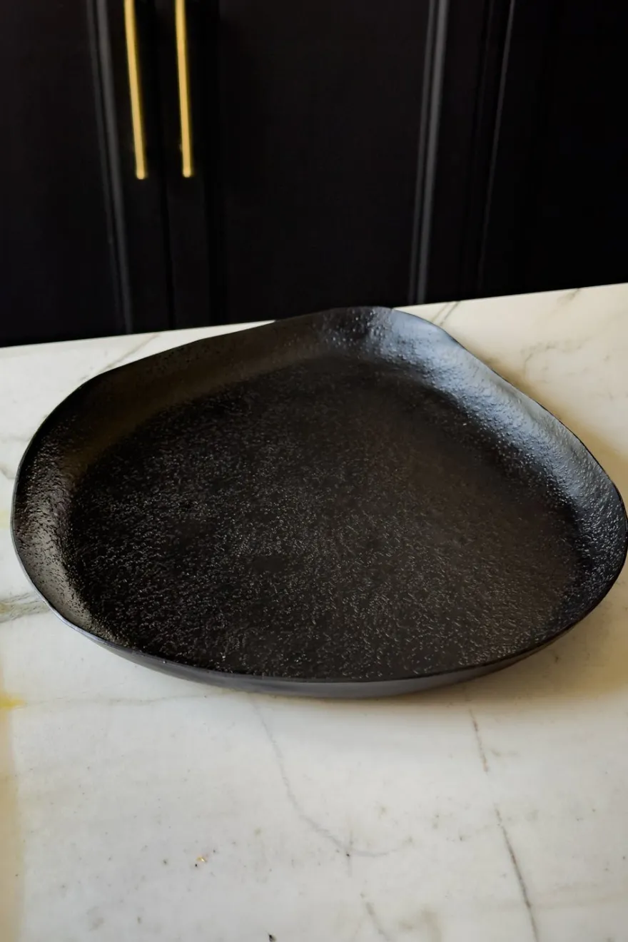 Bandeja negra de aluminio con diseño irregular. Su acabado mate aporta un toque sofisticado a cualquier mesa o celebración. También es ideal para usar como objeto decorativo.