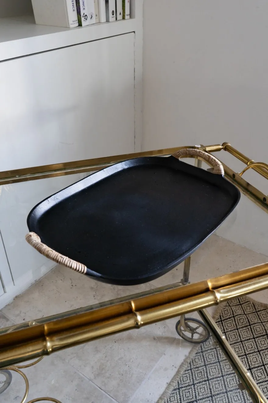 Bandeja rectangular de aluminio negra con asas recubiertas de mimbre. Su acabado mate aporta un toque sofisticado a cualquier mesa o celebración. También es ideal para usar como objeto decorativo.