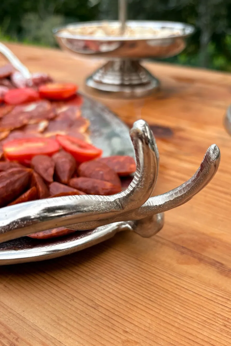 Bandeja oval plateada con asas ornamentadas en forma de cuernos de ciervo, que aportan un toque sofisticado y rústico a la vez. Su acabado plateado le da un toque elegante y moderno, perfecto tanto para decorar como para usar en la mesa.