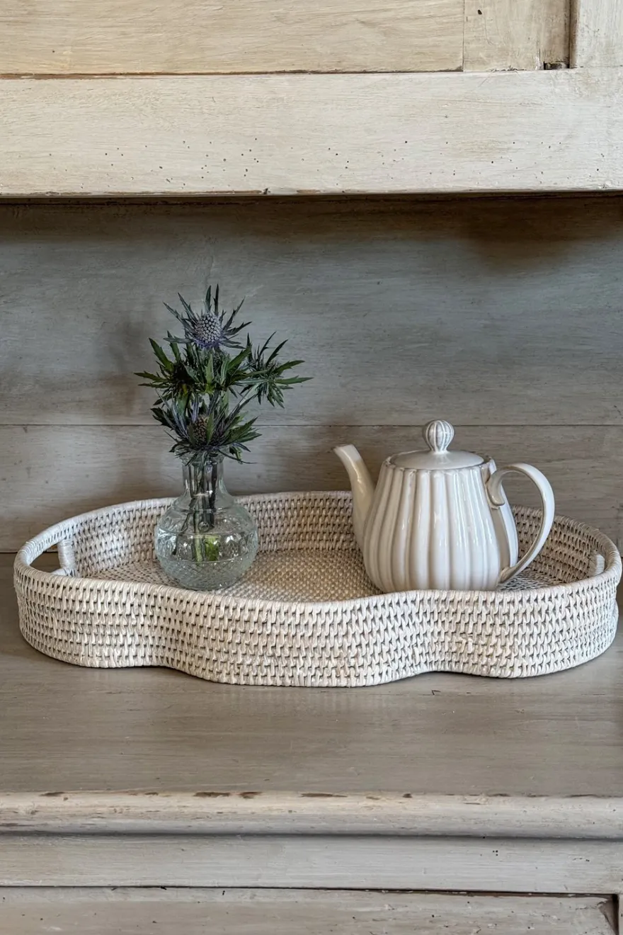 Bandeja ovalada con diseño irregular de ratán blanca con asas, ideal para servir con estilo, organizar tu espacio o como elemento decorativo. Esta colección combina la belleza del material natural con la funcionalidad y el diseño contemporáneo.