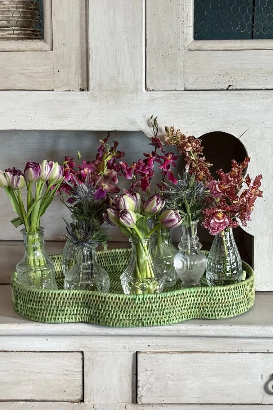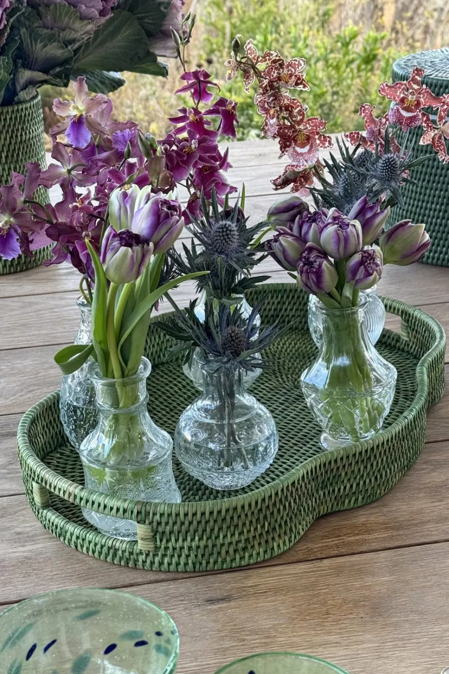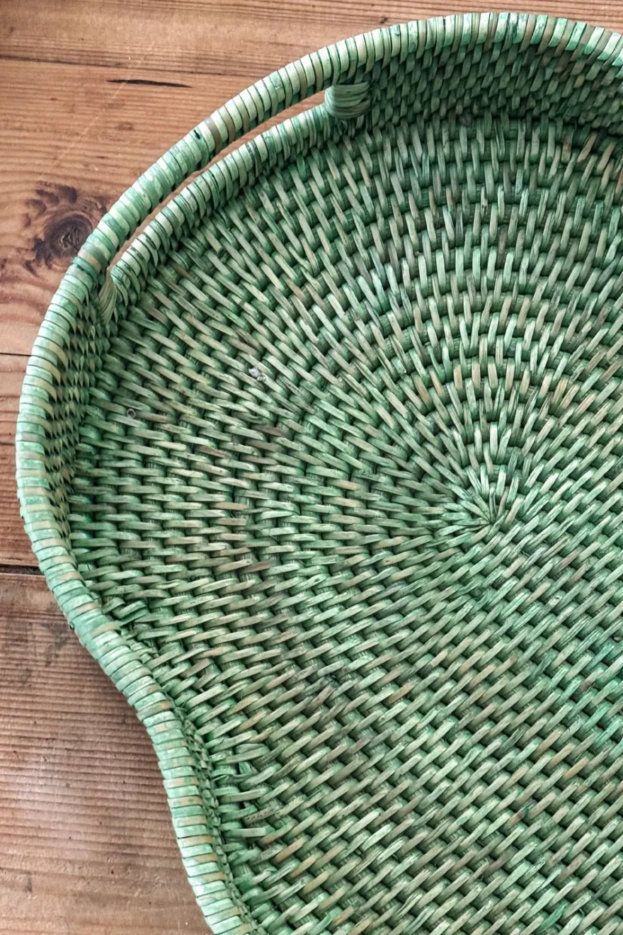 Bandeja ovalada con diseño irregular de ratán verde con asas, ideal para servir con estilo, organizar tu espacio o como elemento decorativo. Esta colección combina la belleza del material natural con la funcionalidad y el diseño contemporáneo.