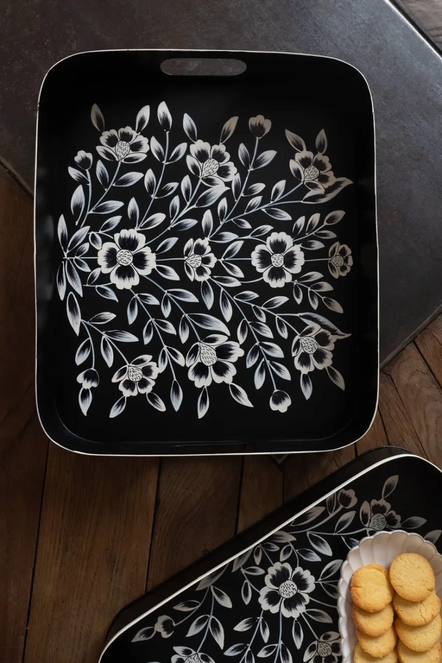 Bandeja rectangular de color negra con flores blancas pintadas a mano, ideal para decorar y dar un toque de estilo a cualquier rincón de tu casa.