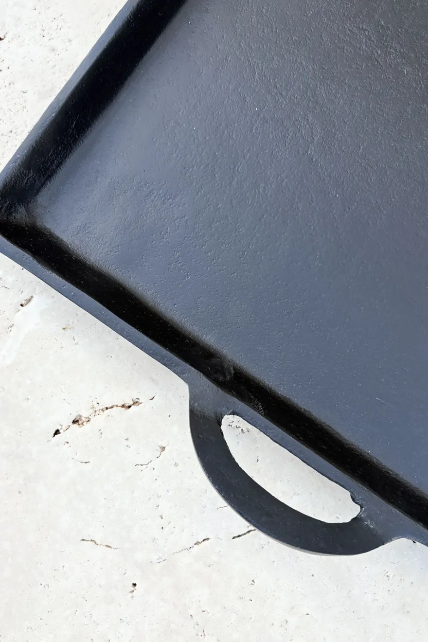 Esta bandeja de aluminio en acabado negro combina estilo y funcionalidad a la perfección. Su diseño sobrio y elegante, junto con las prácticas asas laterales, la convierte en el accesorio ideal para servir con comodidad o para usar como elemento decorativo.