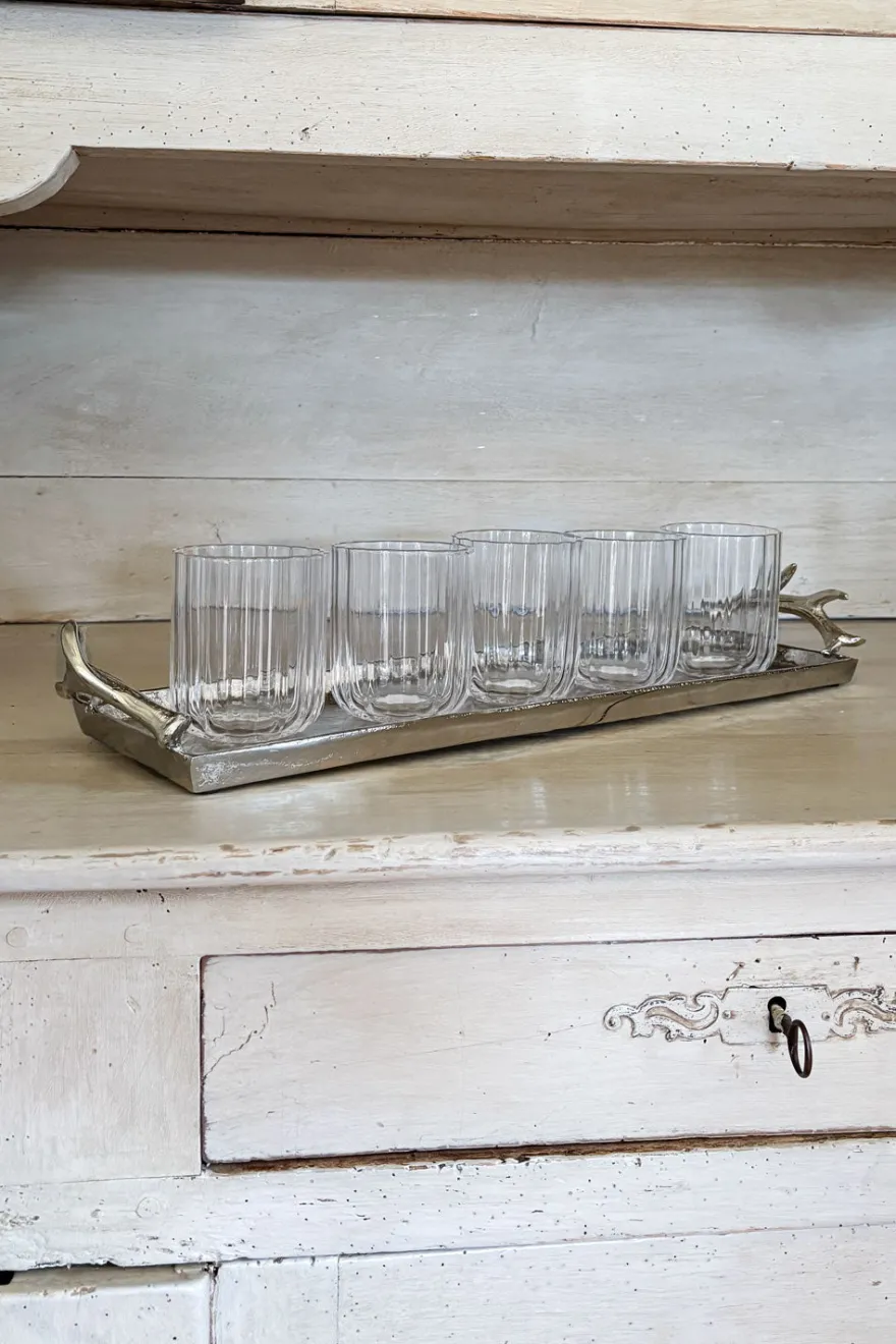 Bandeja rectangular plateada con asas ornamentadas en forma de cuernos de ciervo, que aportan un toque sofisticado y rústico a la vez. Su acabado plateado le da un toque elegante y moderno, perfecto tanto para decorar como para usar en la mesa.