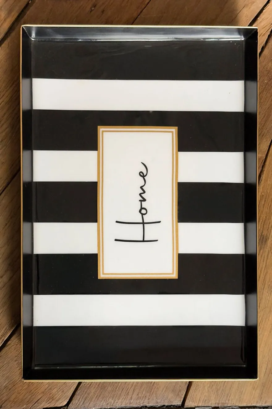 Bandeja rectangular de metal, cuidadosamente barnizada para lograr un acabado brillante que resalta sus detalles. Pintada a mano con un diseño de rayas blancas y negras, y mensaje «Home», además de delicados acabados dorados.