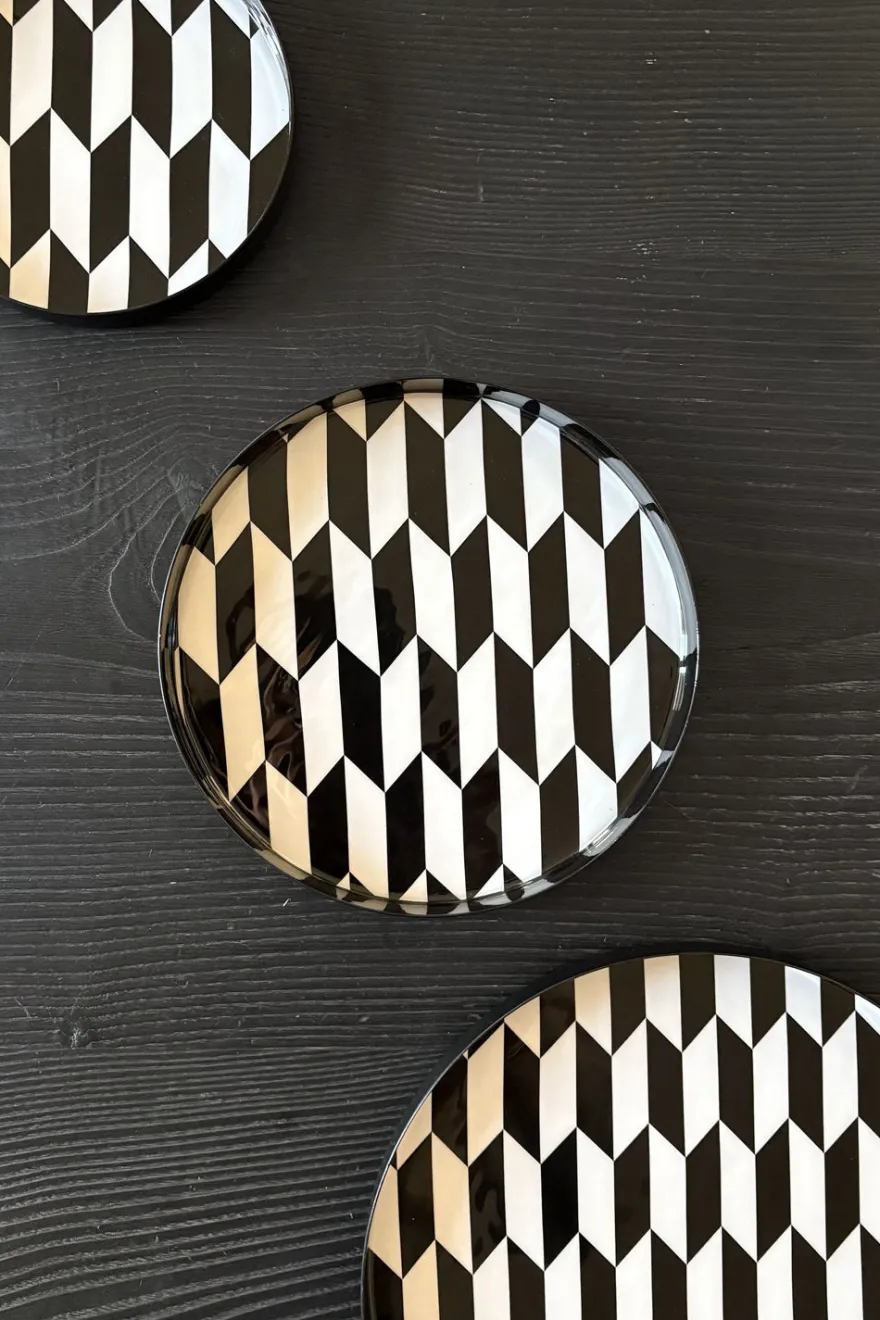 Bandeja decorativa de hierro con acabado esmaltado en blanco y negro, con un diseño geométrico de inspiración moderna que aporta dinamismo y elegancia. Su superficie brillante y su cuidada terminación la convierten en un complemento decorativo versátil y atemporal.