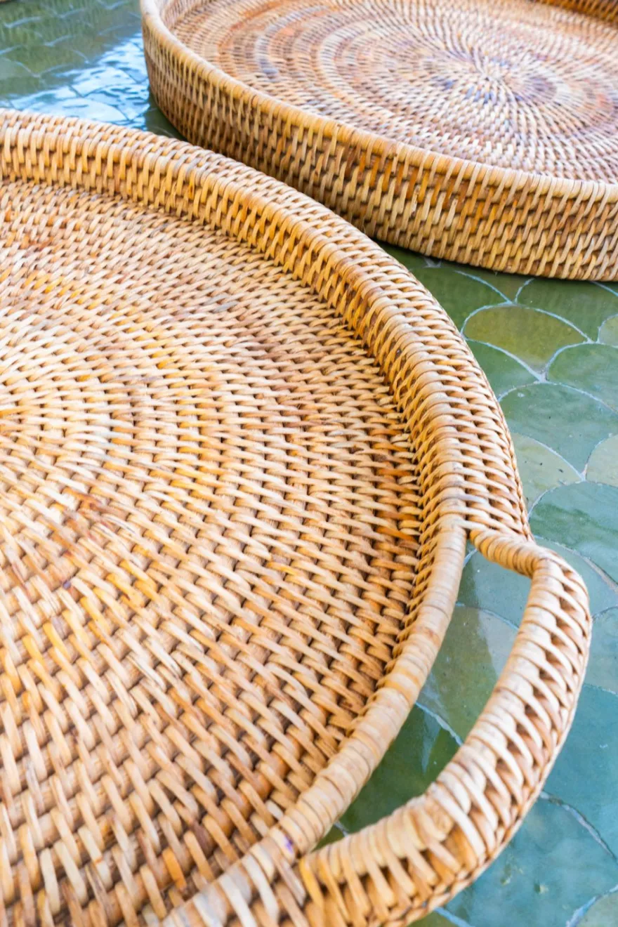 Bandeja redonda de ratán con asas, ideal para servir con estilo, organizar tu espacio o como elemento decorativo. Esta colección combina la belleza del material natural con la funcionalidad y el diseño contemporáneo.