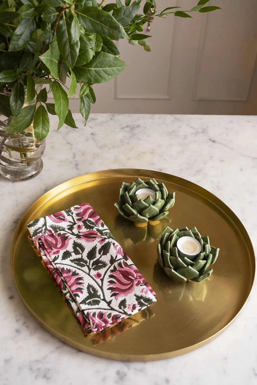 Bandeja redonda en color dorado ideal para decorar cualquier rincón de tu casa.