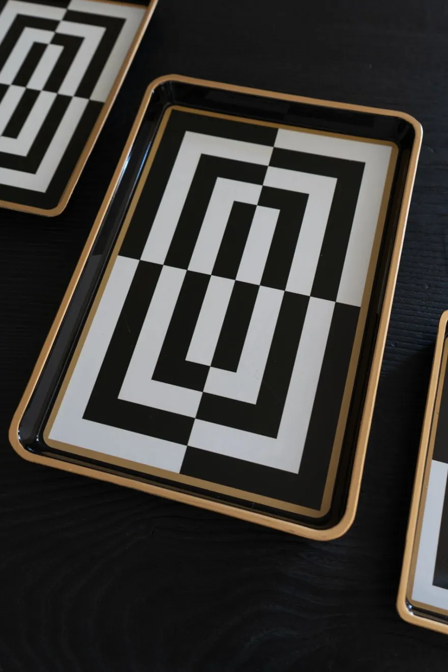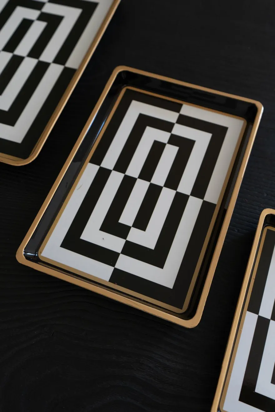 Bandejas decorativas con diseño geométrico de rayas blancas y negras, y con delicado detalle dorado en su borde.