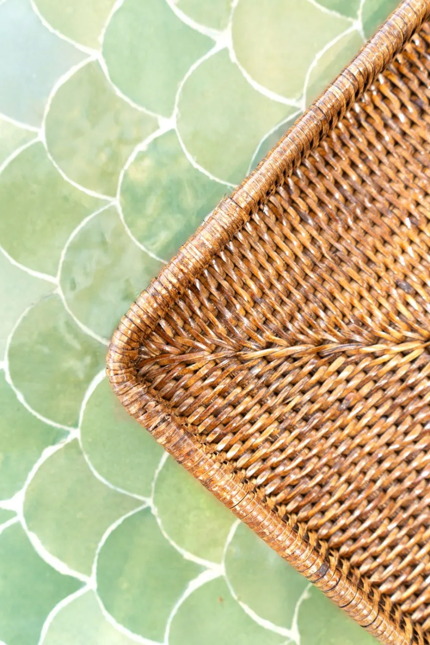 Bandeja rectangular de ratán sin asas con bordes redondeados, ideal para servir con estilo, organizar tu espacio o como elemento decorativo. Esta colección combina la belleza del material natural con la funcionalidad y el diseño contemporáneo.