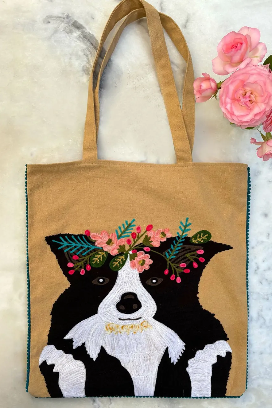 Llena de color y personalidad, esta bolsa con diseño de perro bordada a mano es ideal para llevar lo esencial con estilo y destacar en cualquier ocasión.