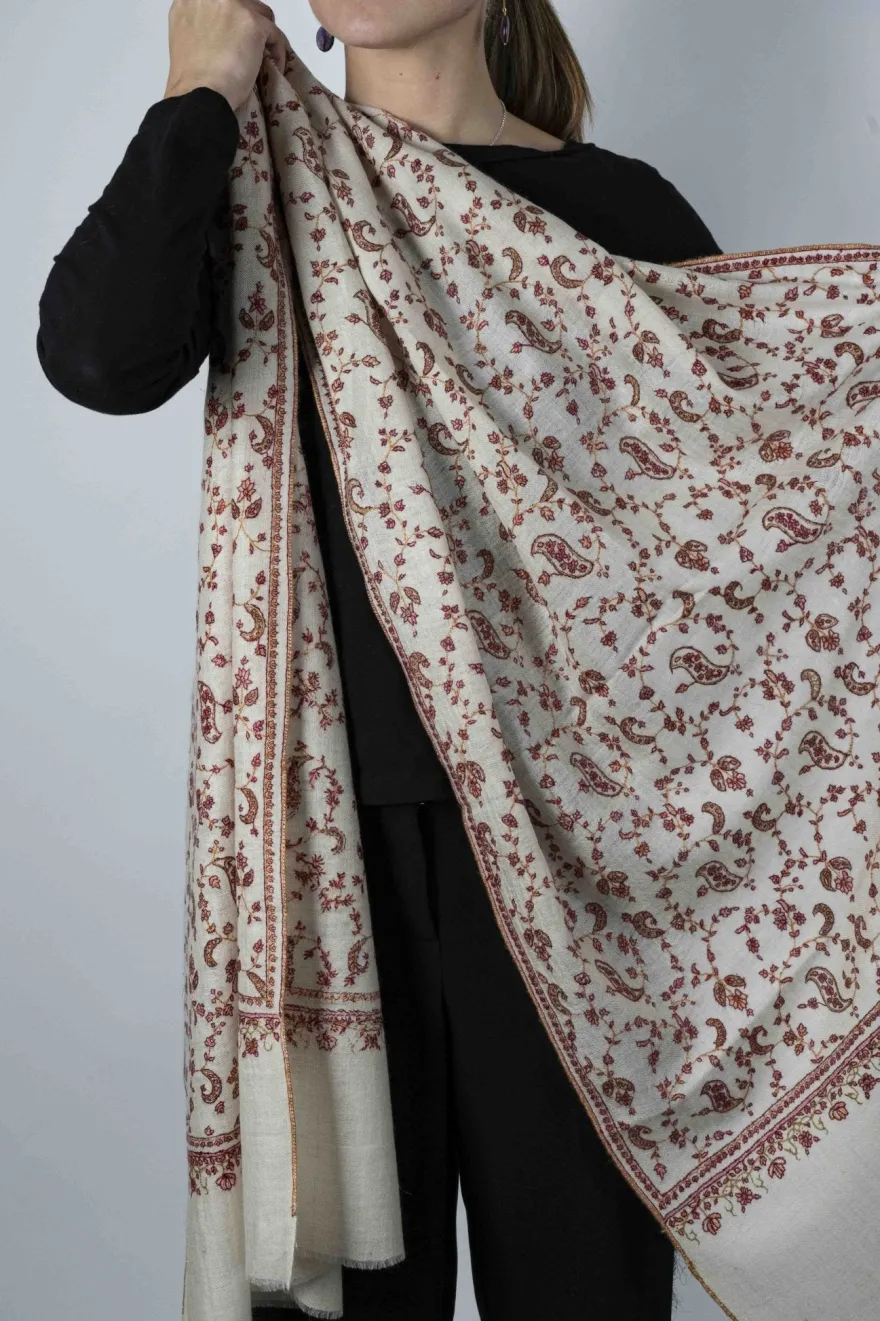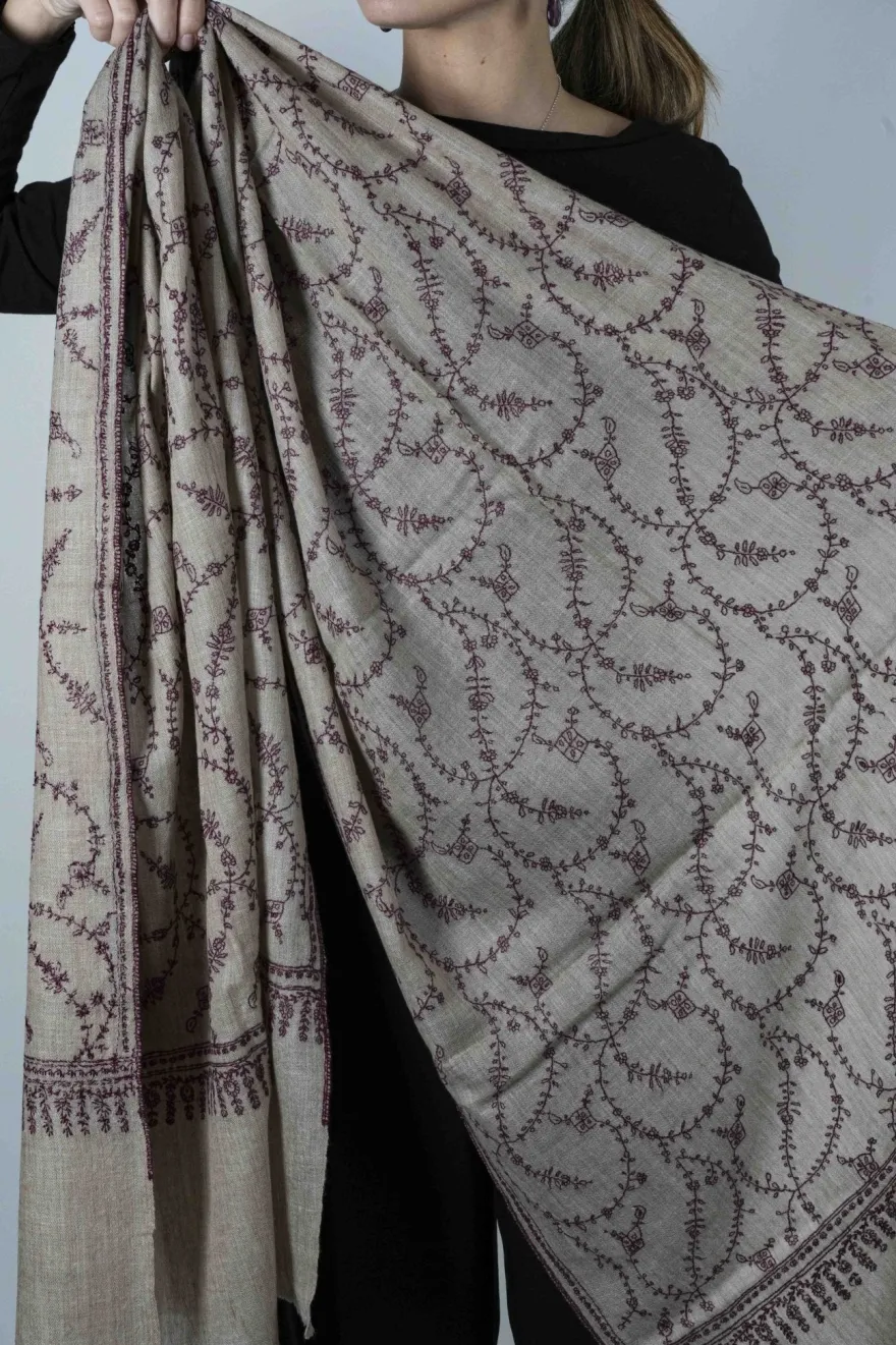Esta bufanda de 100% pashmina además de ser una auténtica joya bordada entera a mano, es una prenda cálida y ligera, ideal para cualquier ocasión, que ofrece una textura increíblemente suave al tacto. Perfecta para abrigarte durante los días fríos.