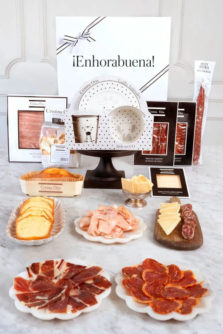 Esta caja para regalar a las recién mamás incluye además de varios productos gourmet para ellas, nuestras vajillas infantiles con diseño propio para los más pequeños.