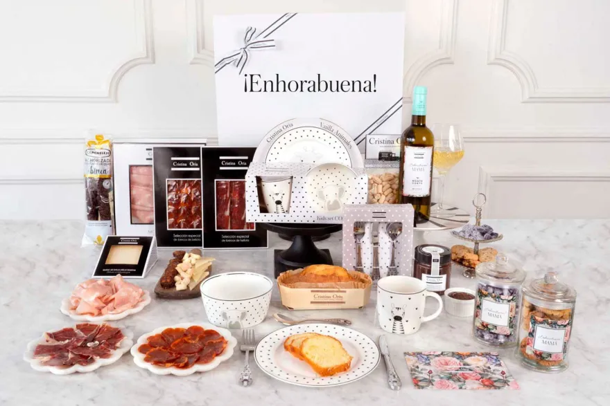 Esta caja es una de nuestras opciones más completas para regalar a las recién mamás, ya que incluye una gran variedad de nuestros mejores productos gourmet, además de nuestra vajilla y cubertería con diseño propio Cristina Oria para el recién nacido.