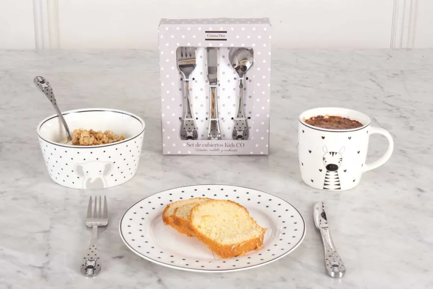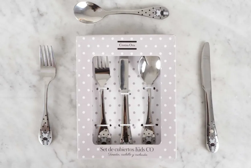 – Cubertería infantil con diseño propio Cristina Oria con diseño de animales (incluye tenedor, cuchillo y cucharita)