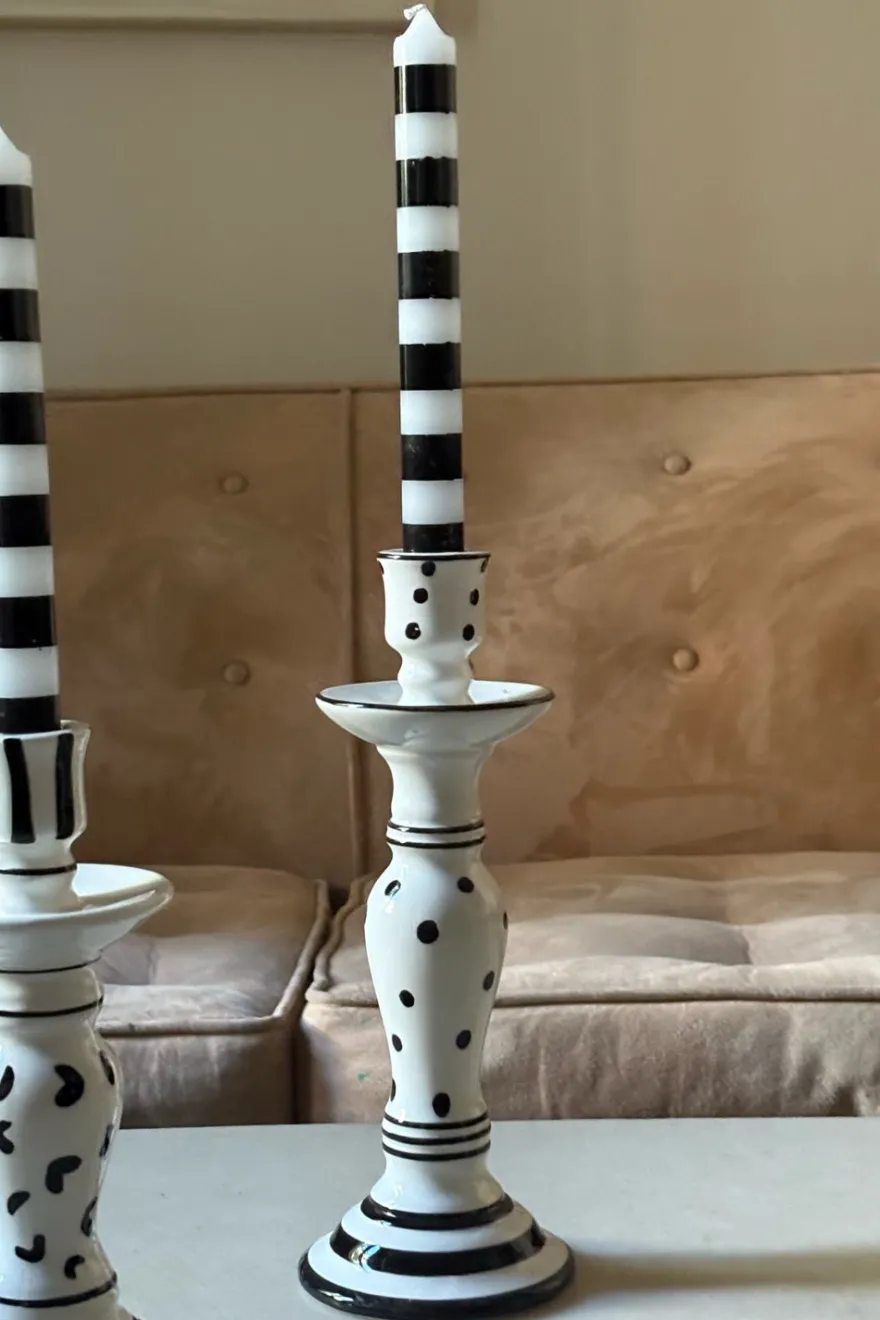 Candelabro de cerámica con diseño abstracto en blanco y negro pintados a mano. Su forma original y el contraste de colores lo hacen ideal para darle un toque moderno a cualquier espacio. Perfecto para crear una atmósfera cálida y elegante con una vela delgada o simplemente como objeto decorativo por sí mismo. Cada pieza es única gracias a su acabado artesanal.