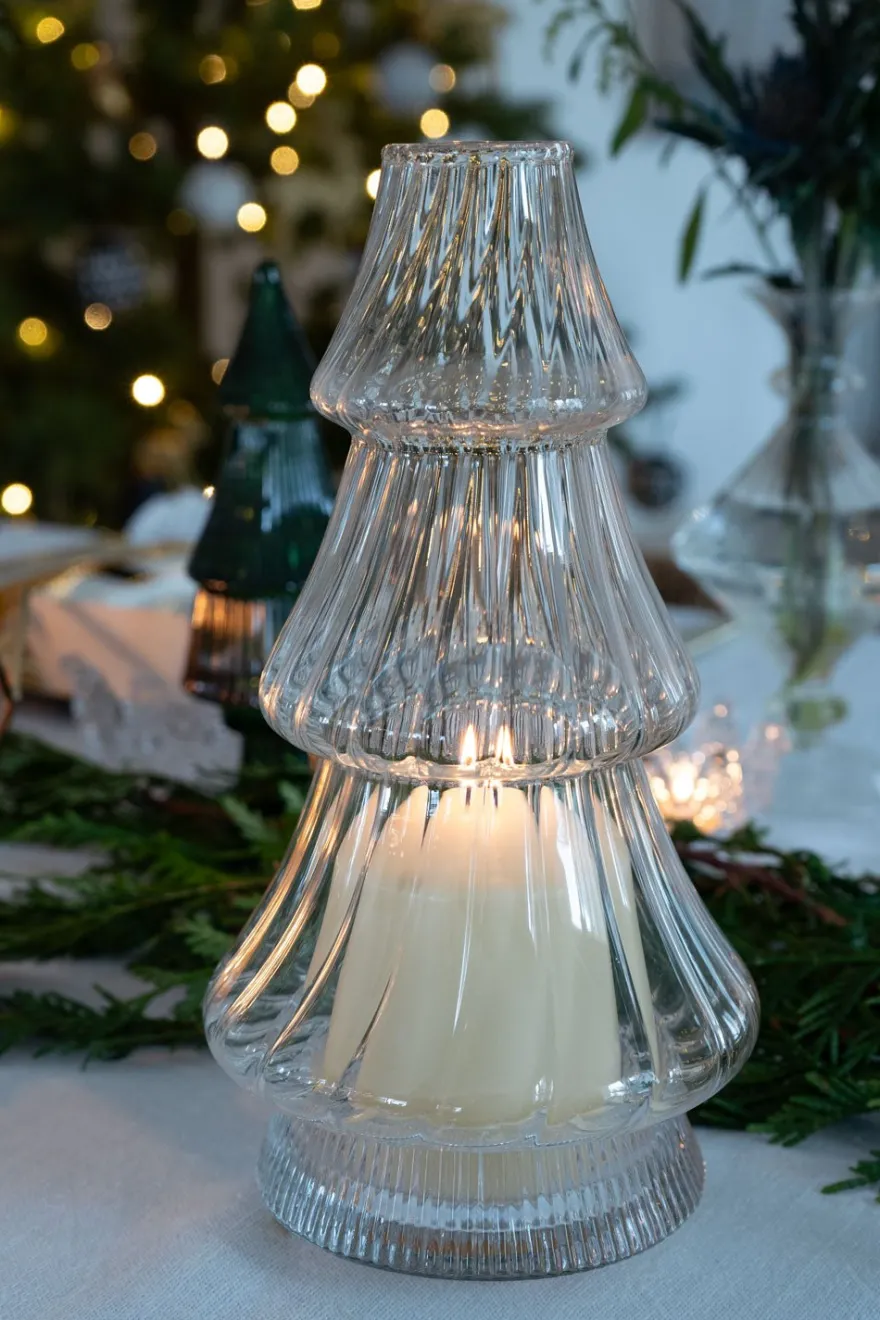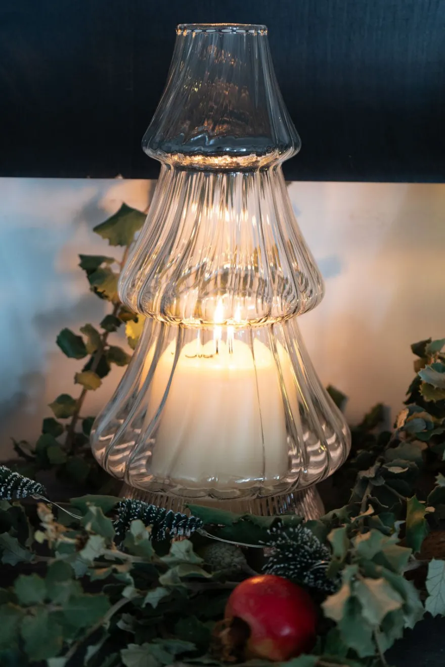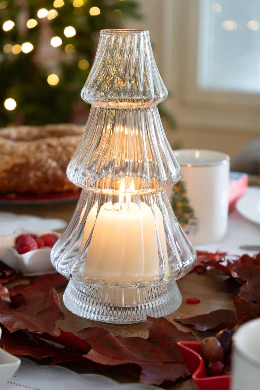 Candelabro o portavelas de cristal con diseño de abeto, ideal para ambientar y decorar cualquier rincón de tu casa durante las Navidades o en cualquier época del año.
