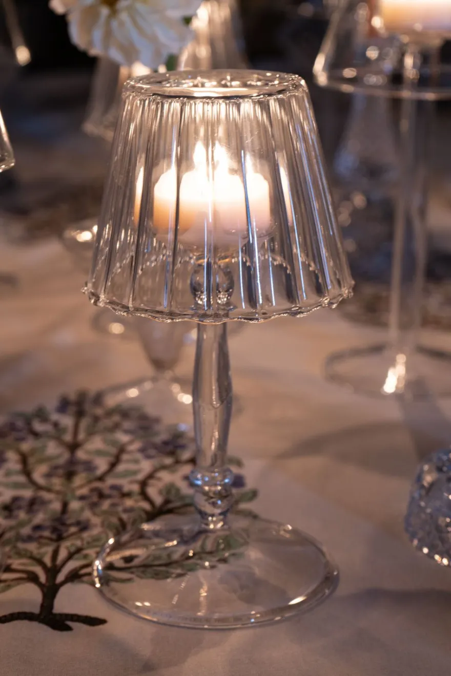 Candelabro o portavelas de cristal transparente con diseño de lámpara y detalles ondulados, ideal y versátil para ambientar y decorar cualquier rincón de casa durante todo el año.