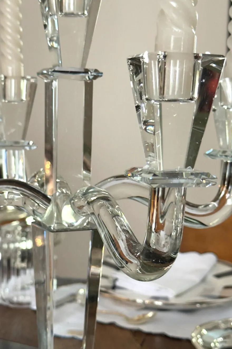 Elegante candelabro de cristal con cinco brazos para velas altas. Su diseño clásico y transparente aporta un toque de distinción y brillo a cualquier rincón. Ideal como centro de mesa o para ambientar cenas y eventos especiales.
