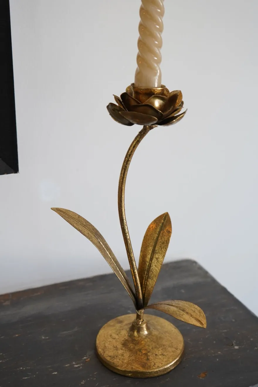 Candelabro de metal de color dorado antiguo con diseño de flor, ideal para dar un aspecto lujoso, elegante y atemporal a cualquier rincón de tu casa, e incluso para colocar como centro de mesa en ocasiones especiales.