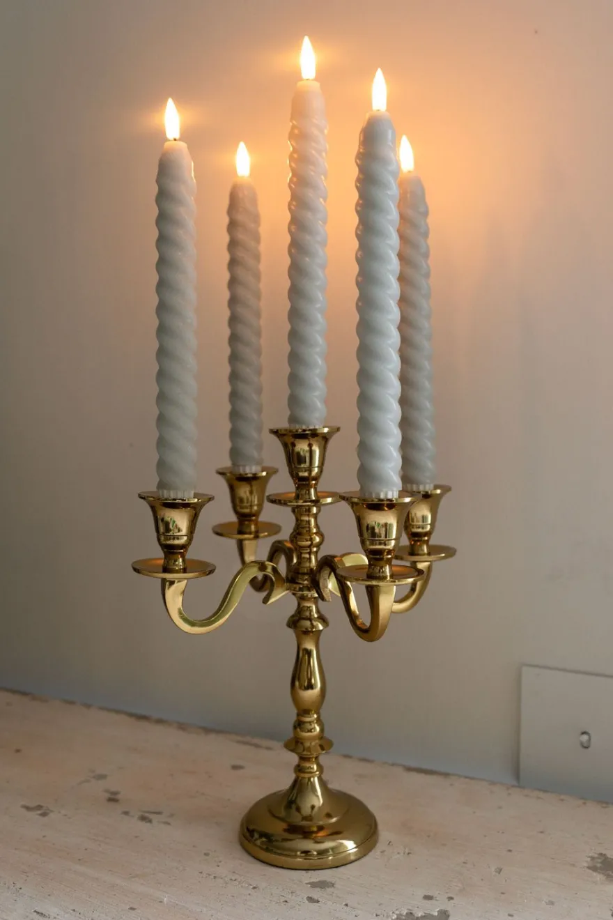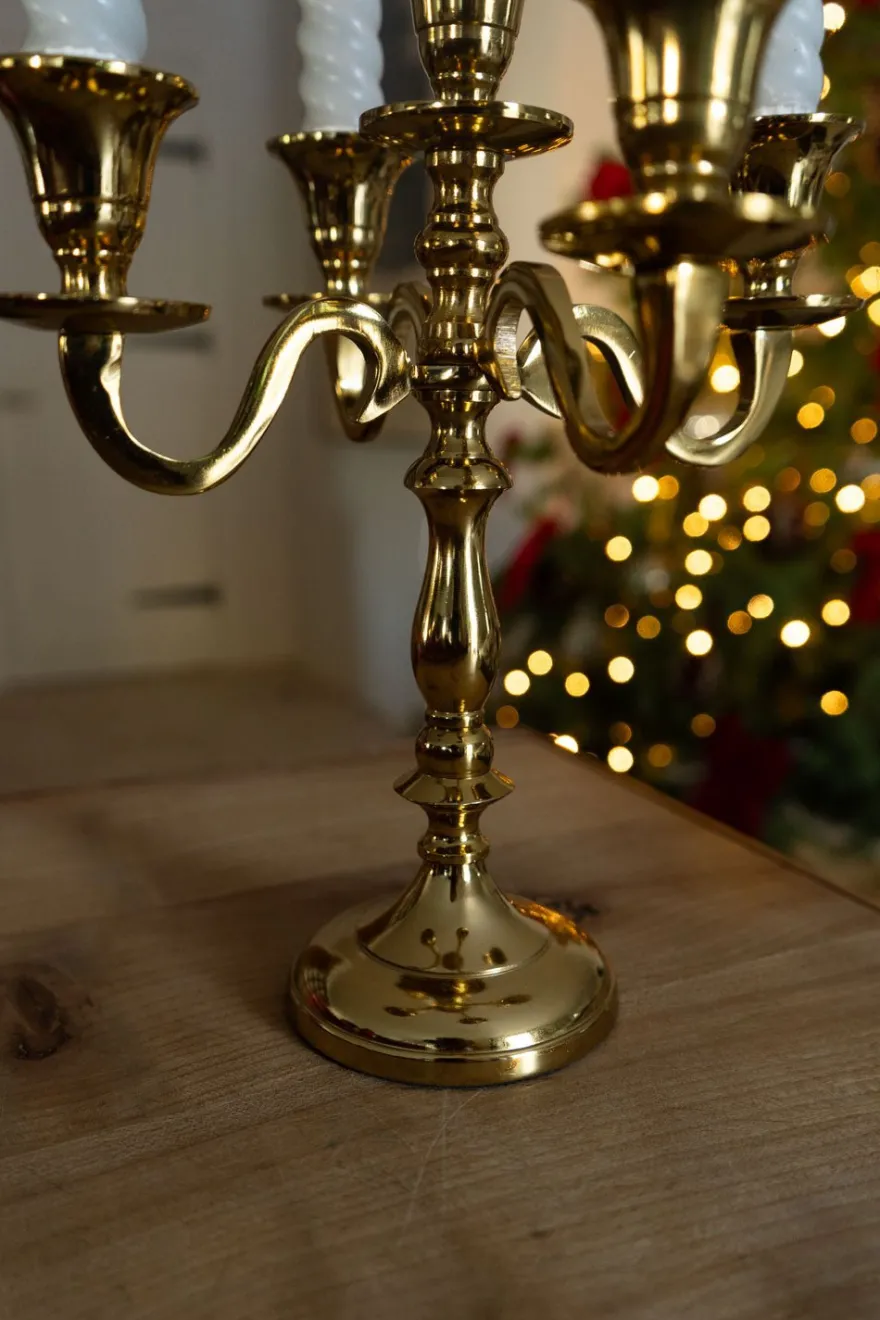 Candelabro de latón dorado con un diseño clásico y elegante, que cuenta con cinco soportes para velas altas. Perfecto para crear una atmósfera sofisticada y cálida en cenas, eventos especiales o como pieza decorativa en cualquier espacio. Su acabado brillante aporta un toque de lujo y estilo atemporal.