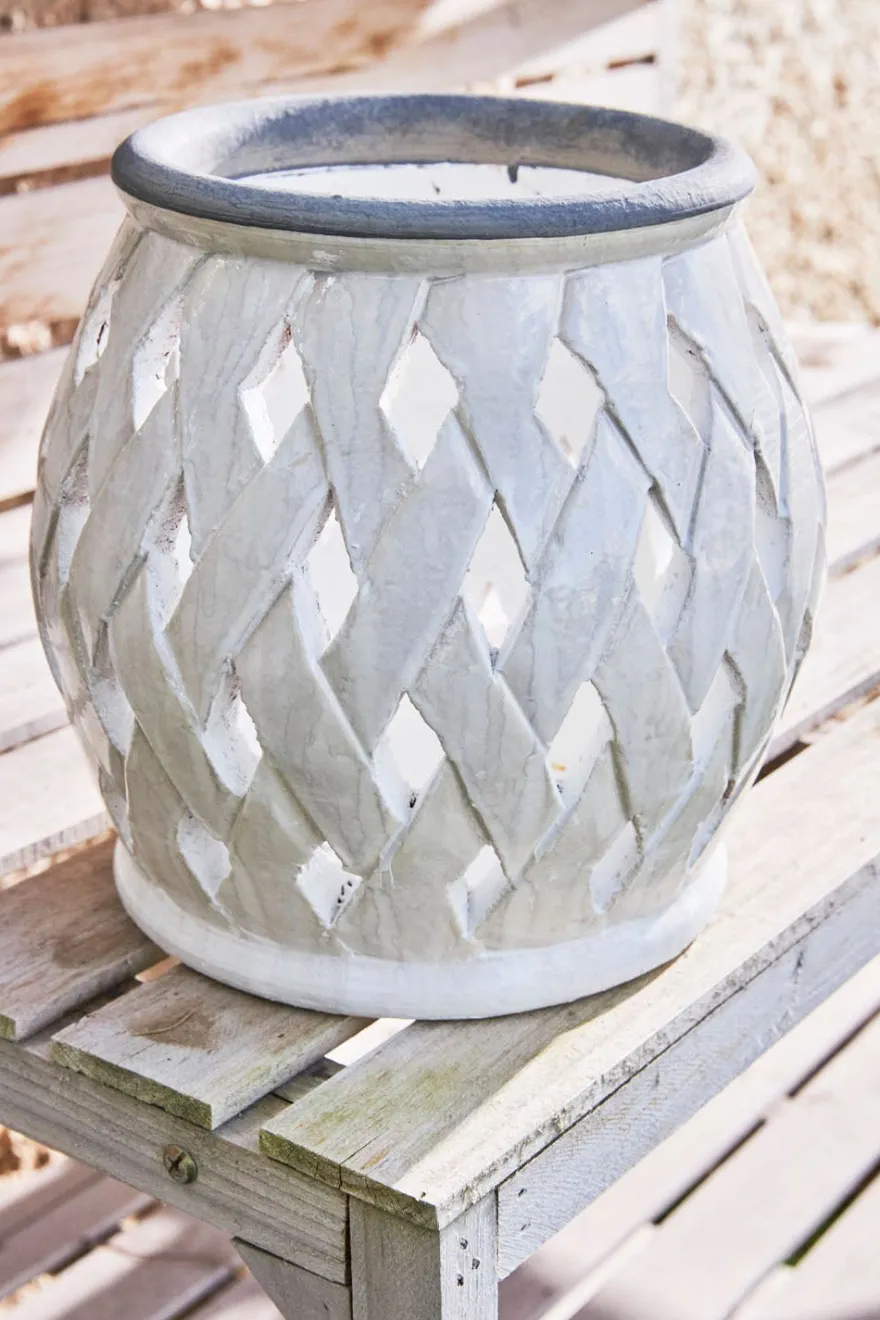 Portavela de cerámica con diseño trenzado en color blanco. Ideal tanto para exteriores como para interiores.