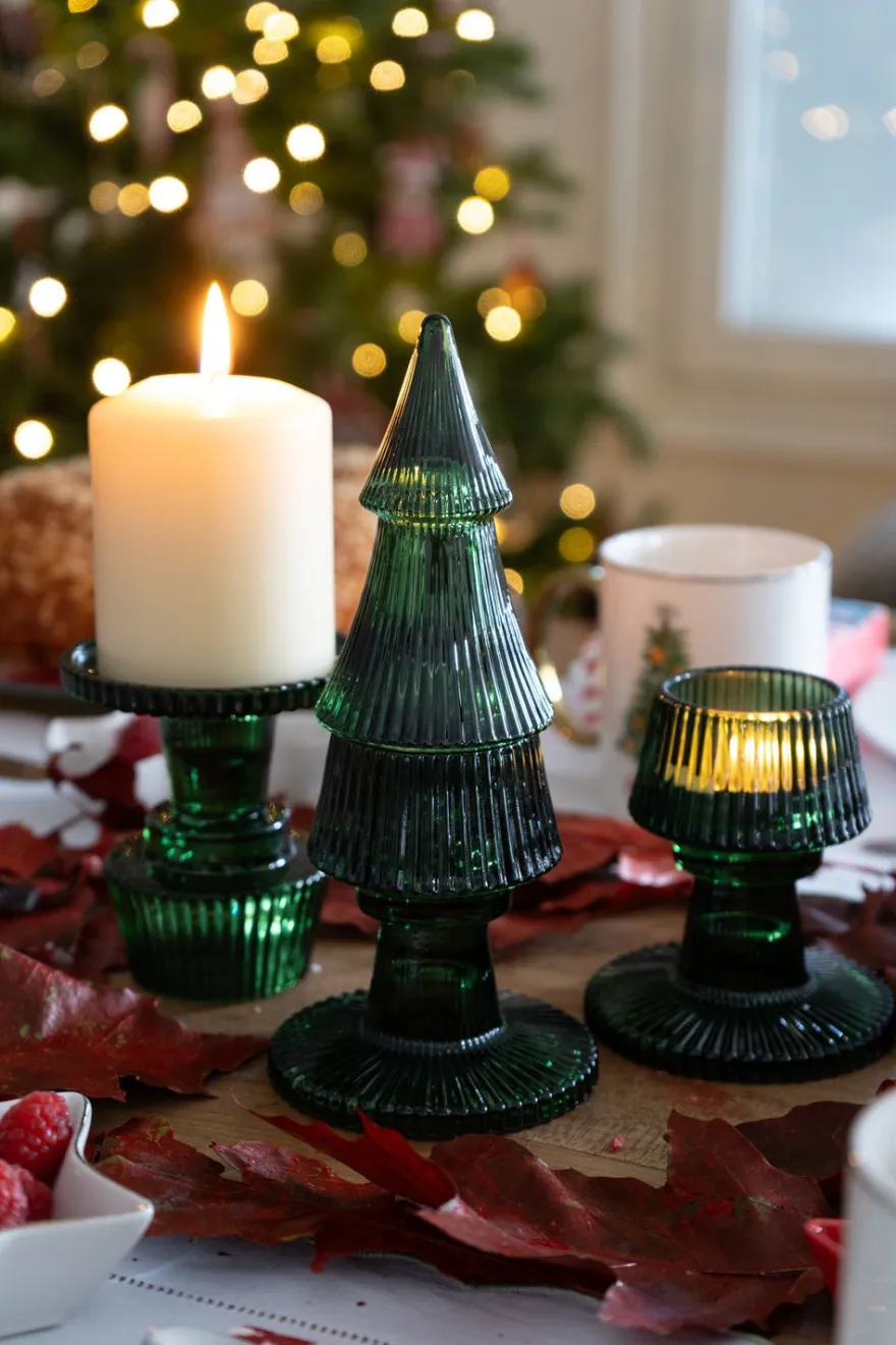 Portavelas de cristal con diseño de abeto, ideal para ambientar y decorar cualquier rincón de tu casa durante las Navidades o en cualquier época del año.