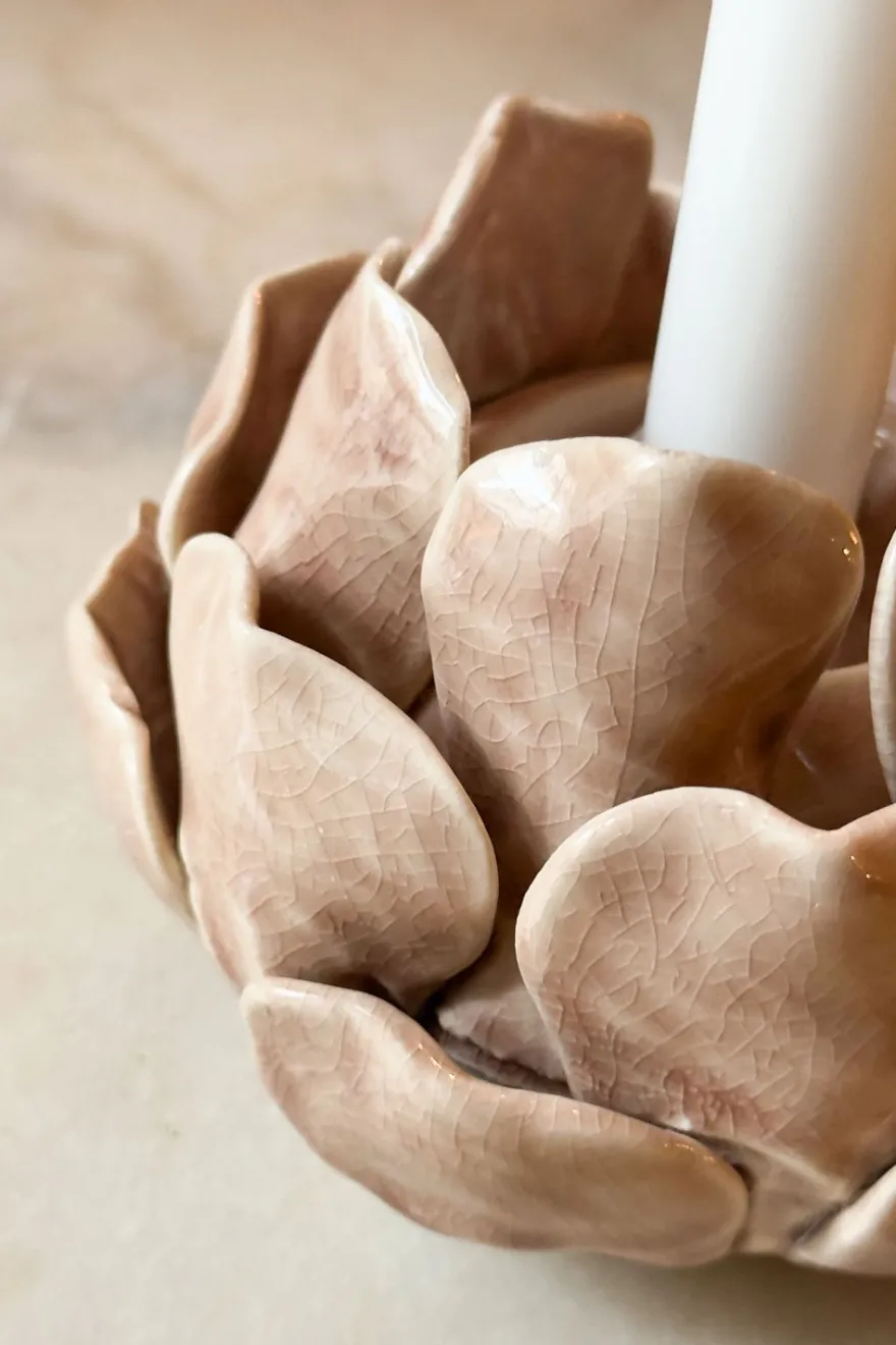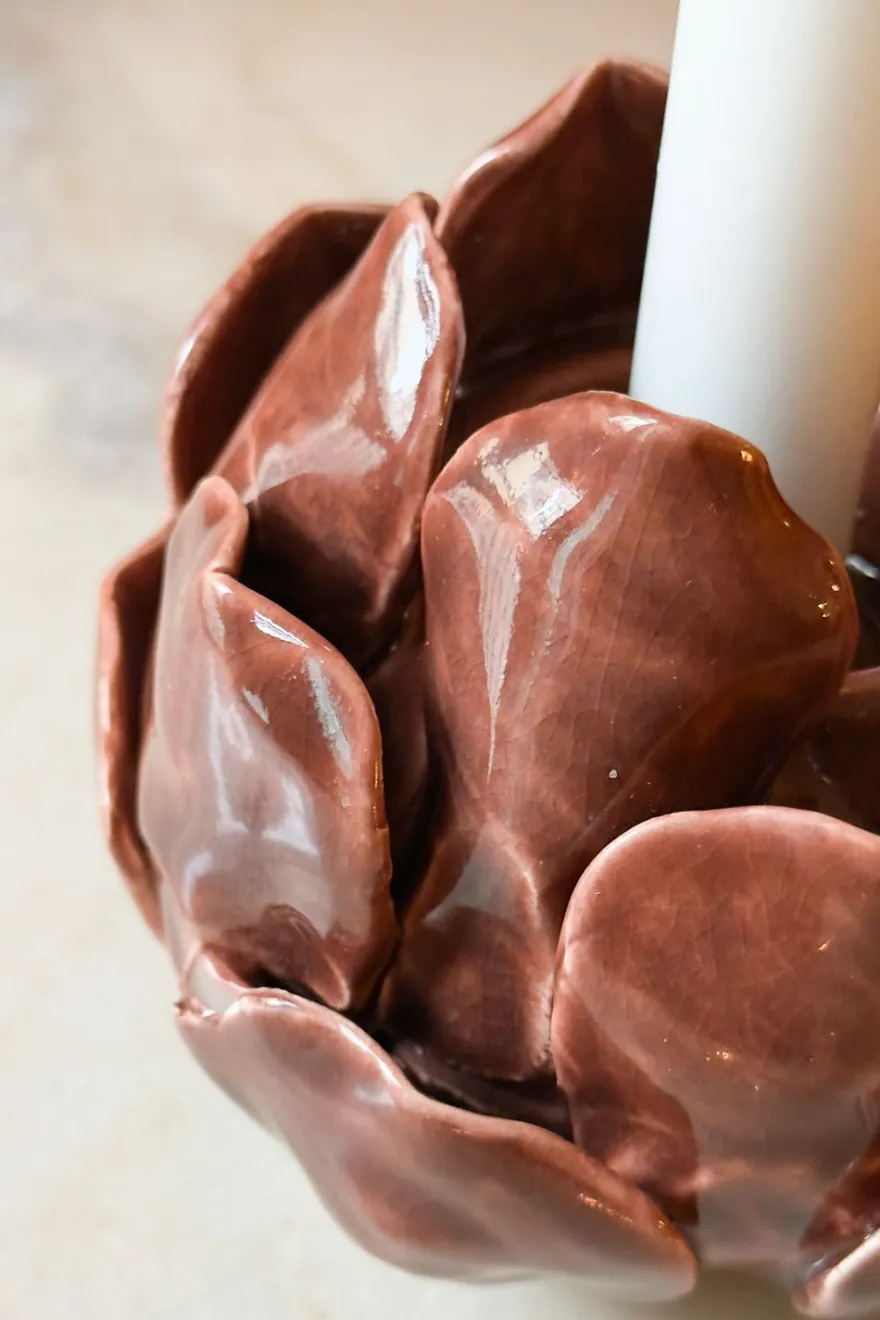 Elegante portavelas de loza fina esmaltada, con un delicado diseño de flor. Su diseño artesanal y atemporal lo convierten en una pieza versátil que complementará cualquier estilo de decoración.