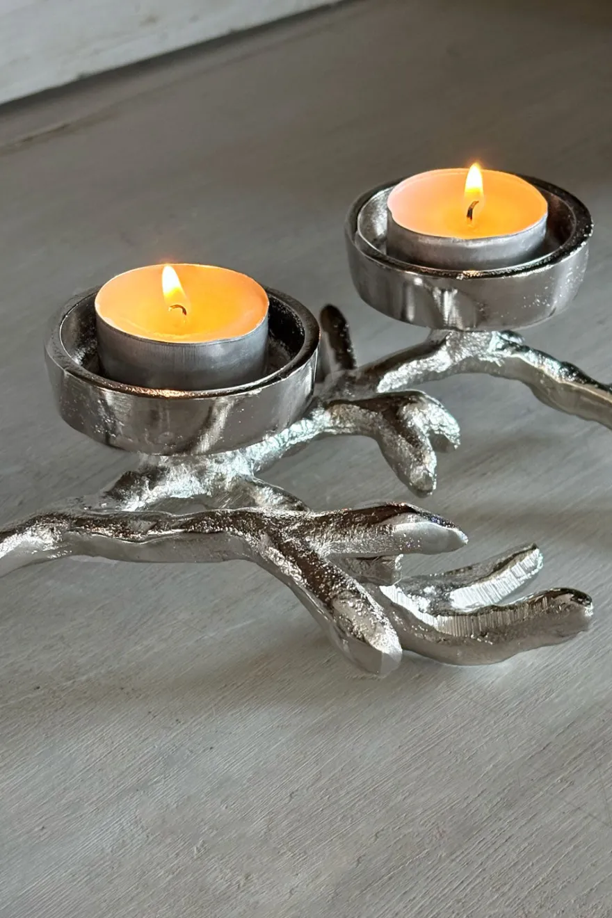 Elegante portavelas plateado con diseño inspirado en astas de ciervo. Dispone de tres soportes para velas. Ideal como centro de mesa o accesorio decorativo, este portavelas combina un estilo rústico y contemporáneo, aportando calidez y distinción a cualquier espacio.