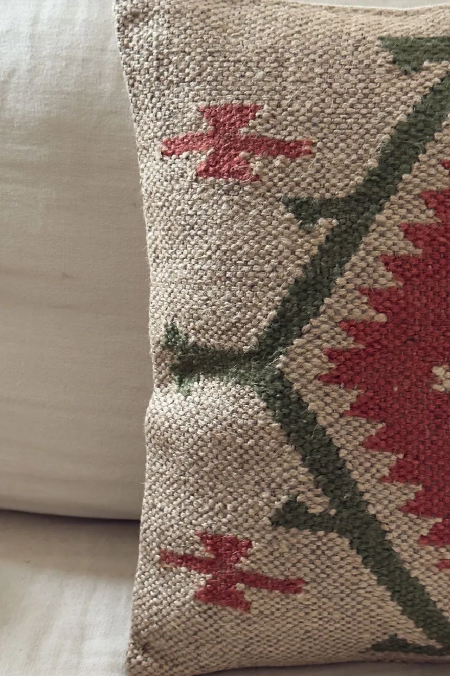 Colección de cojines elaborados en yute y lana, materiales naturales que aportan textura, calidez y un carácter artesanal a cualquier espacio. Sus diseños geométricos, inspirados en tejidos tradicionales tipo kilim, combinan tonos tierra y motivos étnicos que encajan fácilmente en ambientes boho, rústicos o contemporáneos.