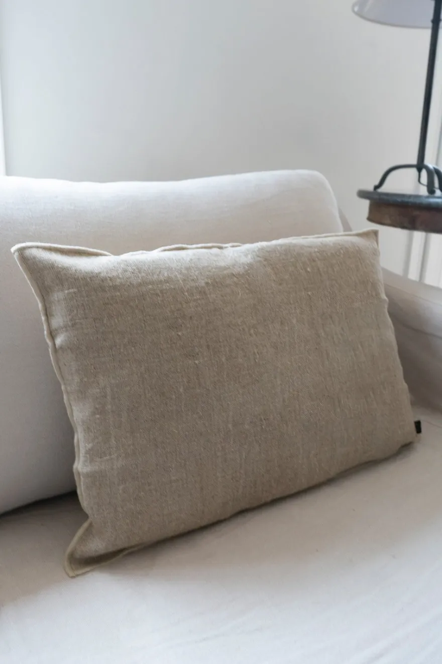 Cojín de lino hecho a mano, en color beige con borde del mismo color en una tonalidad más clara, que le dará un aspecto fresco, elegante y lujoso a tu salón o dormitorio.