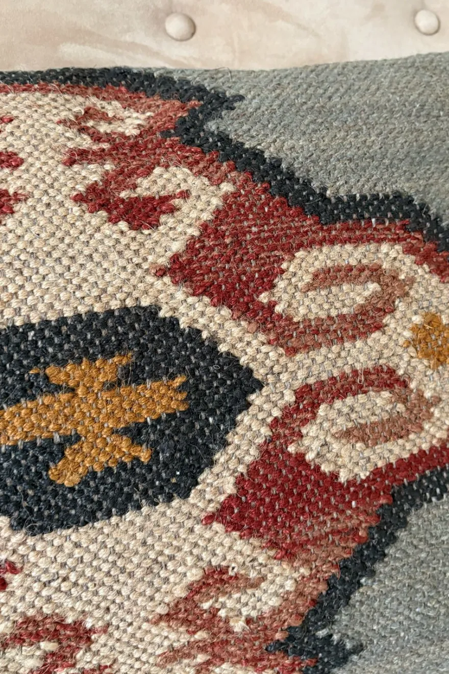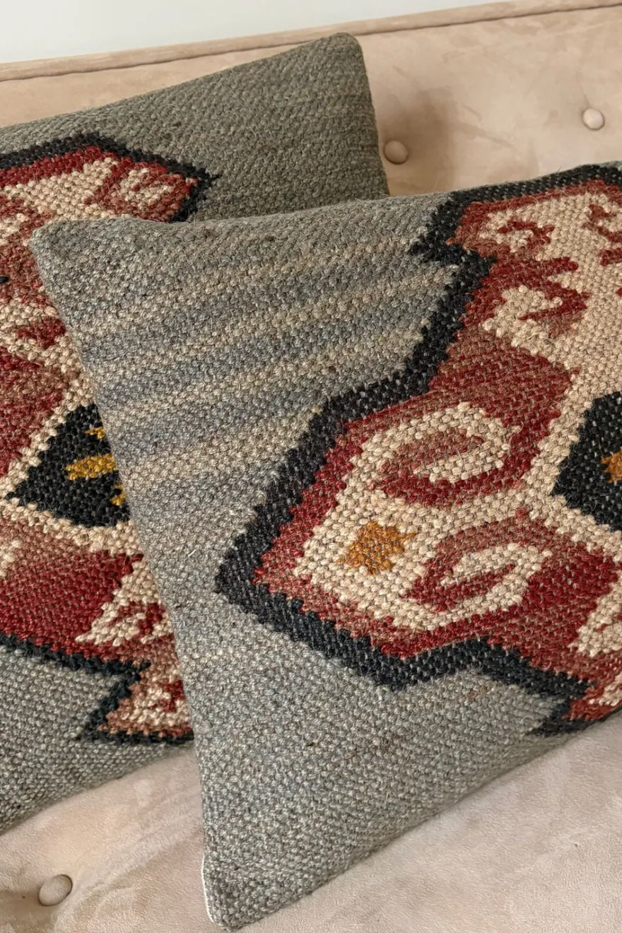 Colección de cojines elaborados en yute y lana, materiales naturales que aportan textura, calidez y un carácter artesanal a cualquier espacio. Sus diseños geométricos, inspirados en tejidos tradicionales tipo kilim, combinan tonos tierra y motivos étnicos que encajan fácilmente en ambientes boho, rústicos o contemporáneos.