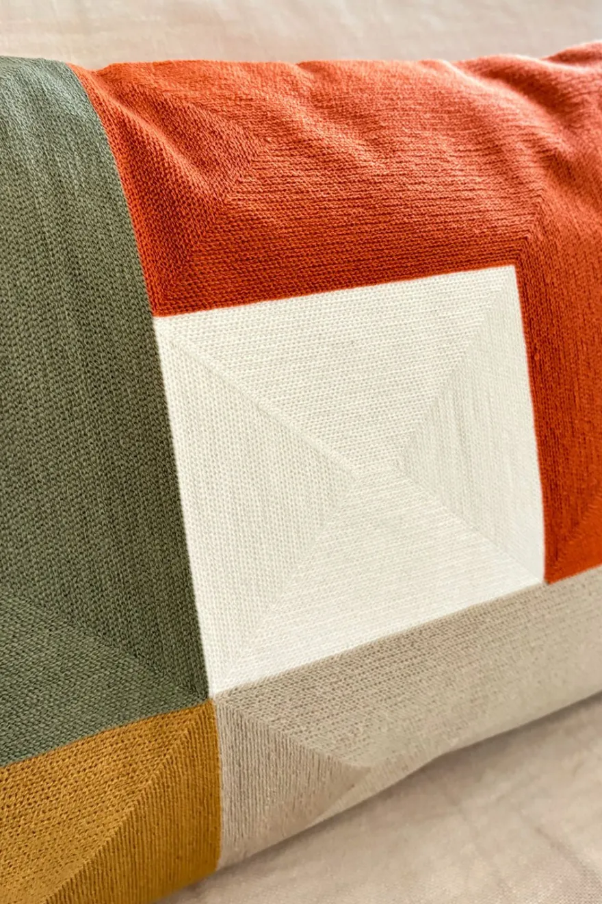 Cojín de 100% algodón en tonalidades negro, verde, naranja, mostaza, beige y blanco.