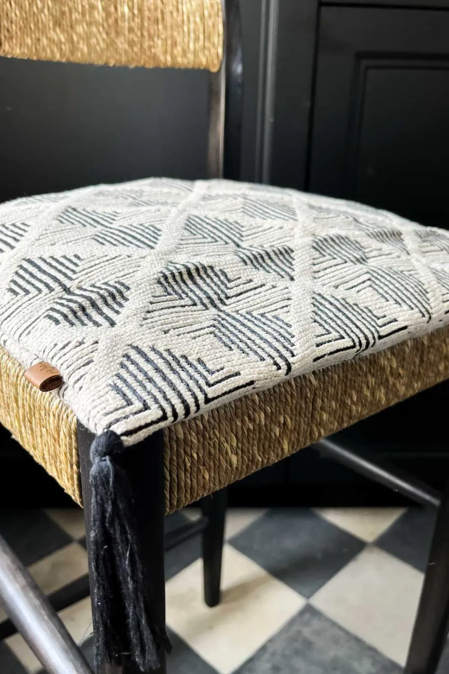 Funda de cojín confeccionada en jacquard de algodón grueso con estampado en colores negro y marfil, y detalle de pompón en una de sus puntas.