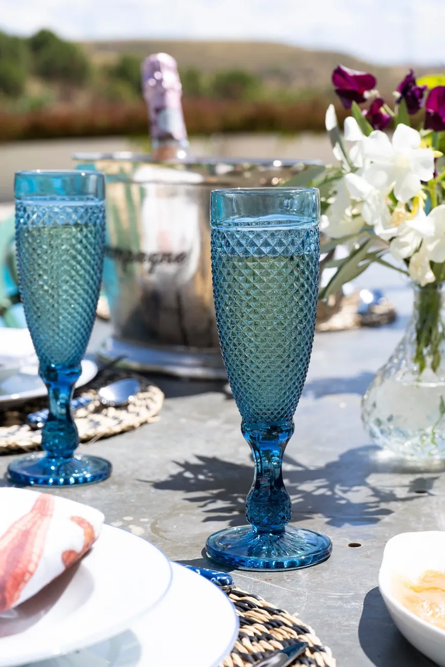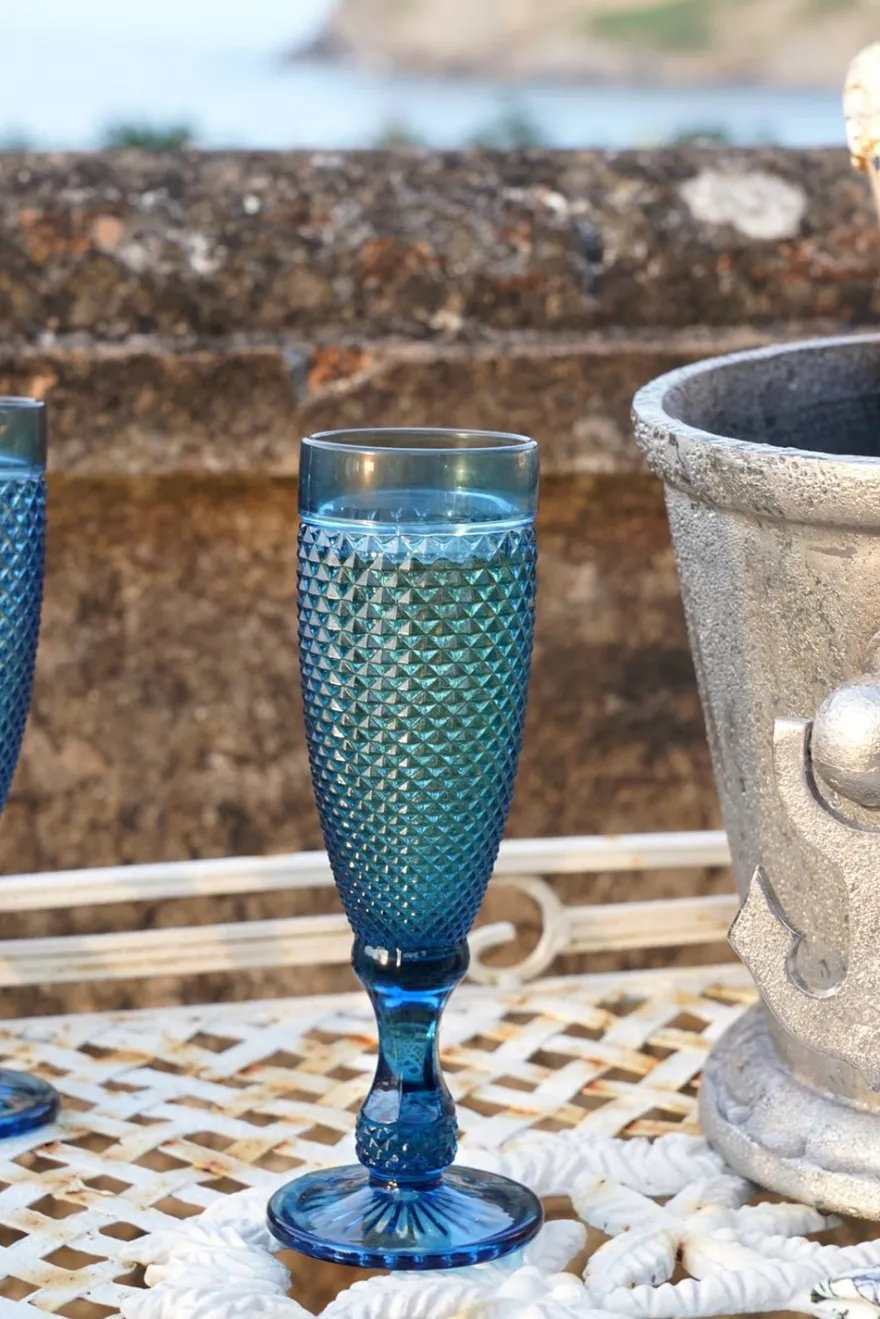 Copa de champagne de cristal tallada con picos teñida en color azul oscuro, ideal para cualquier ocasión.