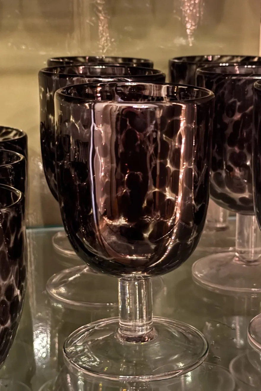 Esta copa de cristal con diseño moteado negro, es una pieza única que aporta sofisticación a cualquier mesa o espacio.