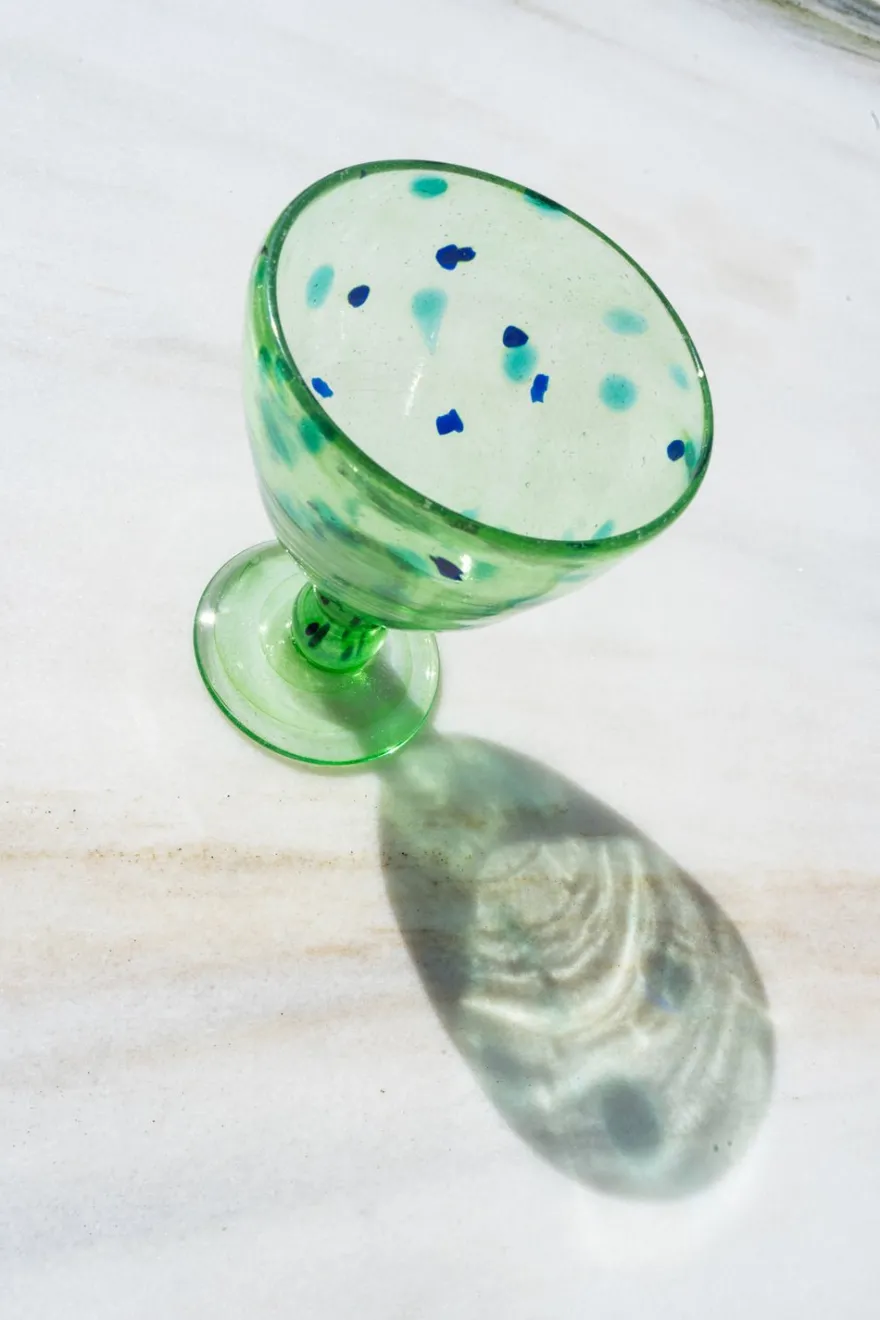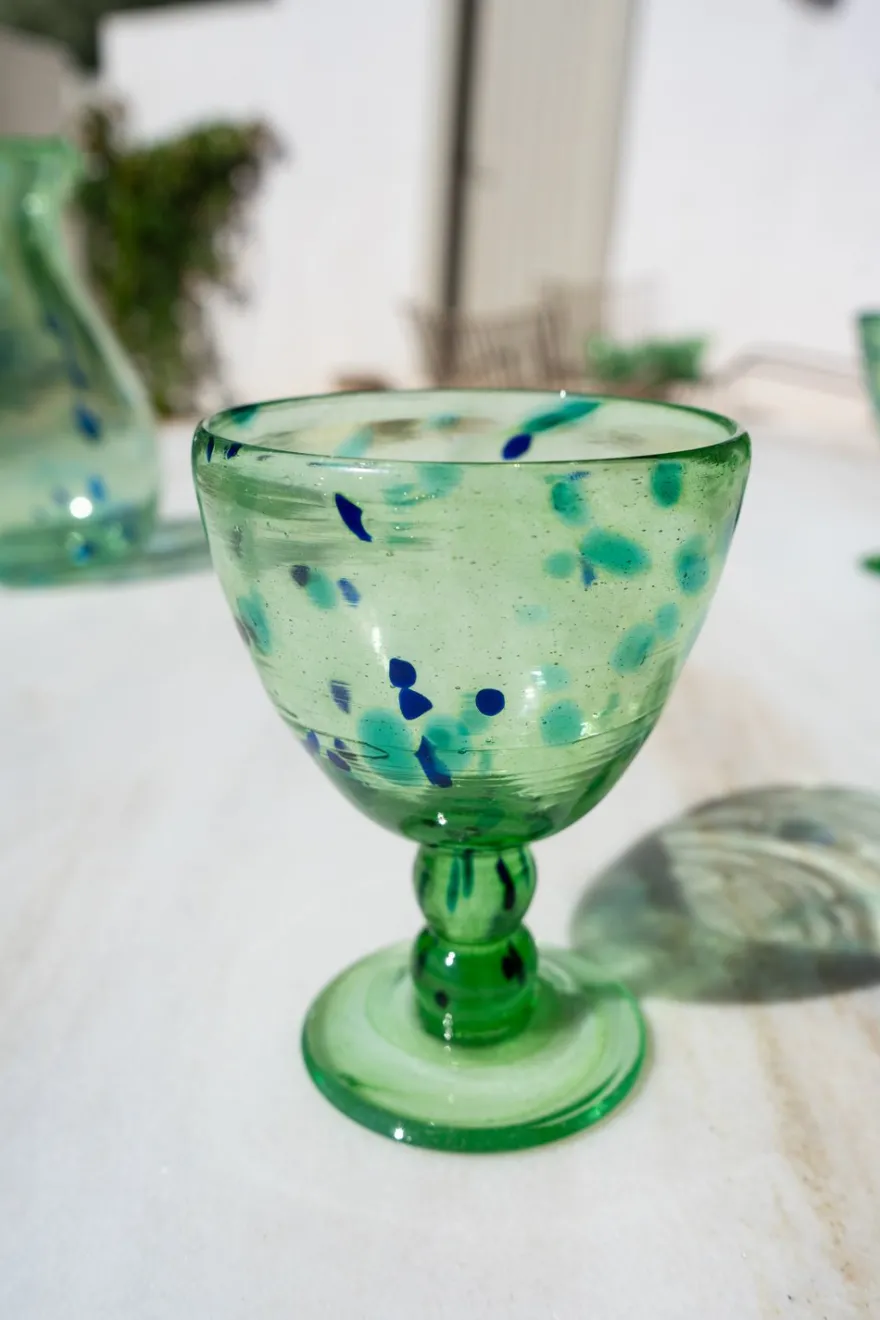 Esta singular cristalería de tonos verdosos con motas de color azul que parece que flotan en su interior, aportará sofisticación a cualquier mesa o espacio, además de ser una obra de arte. Cada pieza de esta colección es única.