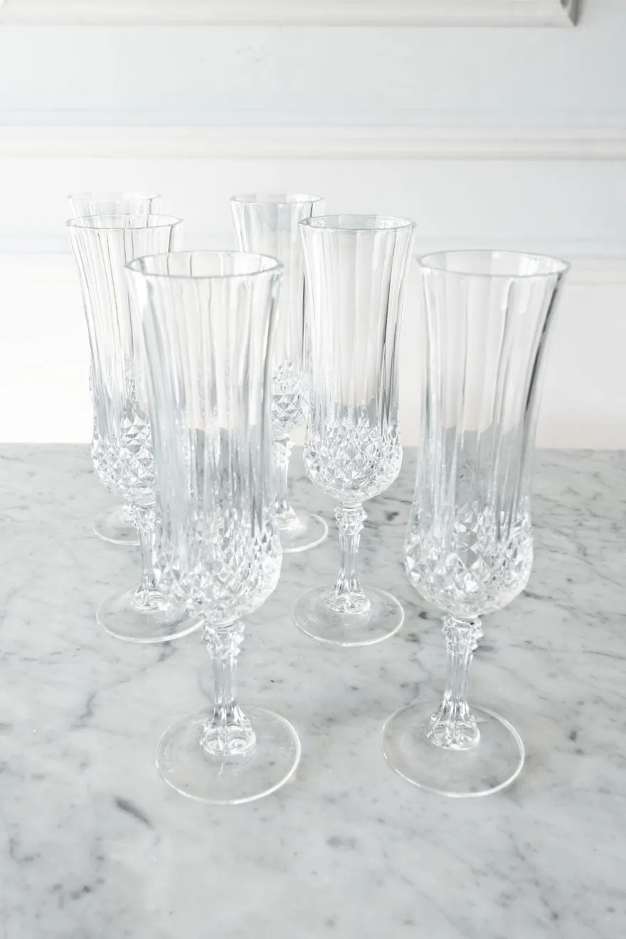 Set de seis copas especiales para champagne, cava, sidra y todo tipo de vinos espumosos, de cristal d’arques del modelo Longchamp, con aspecto tallado que combinan tradición y modernidad en cualquier ocasión.
