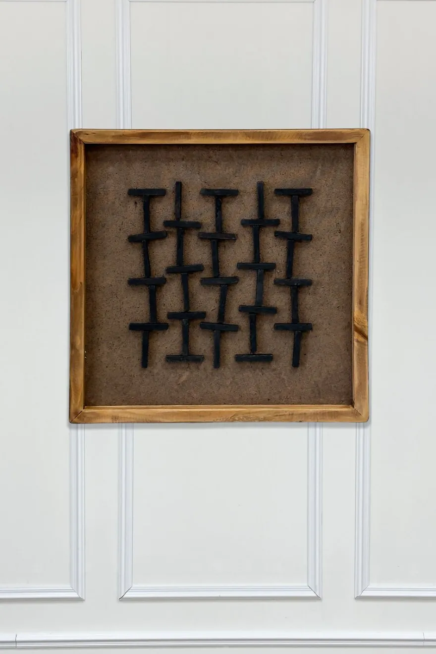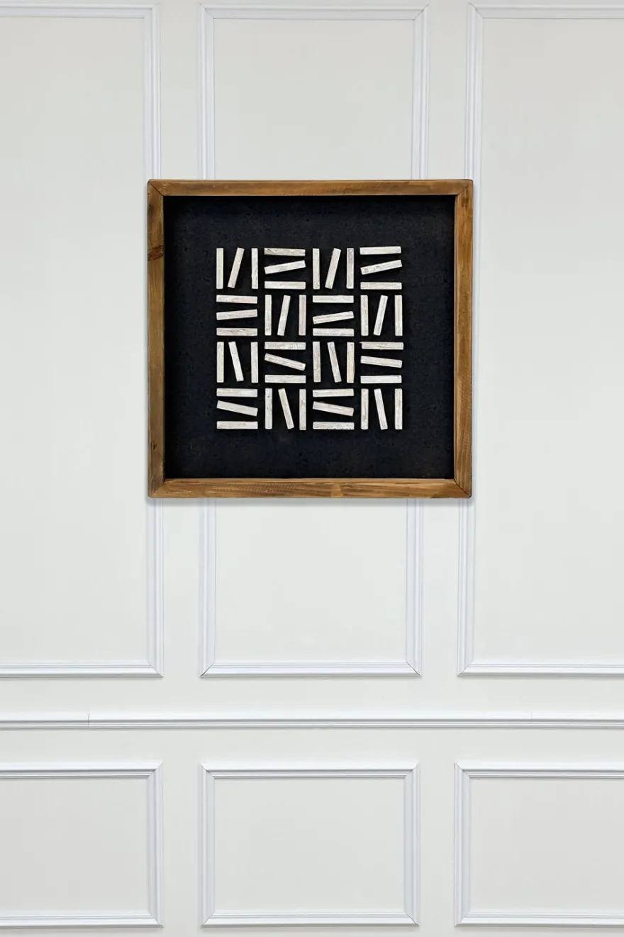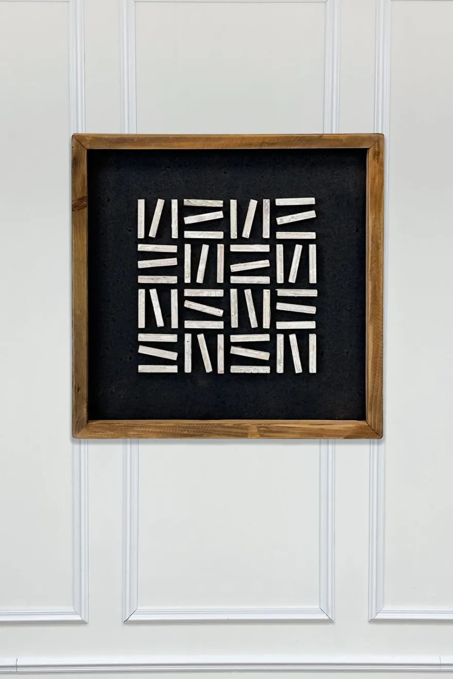 Cuadro decorativo elaborado con madera de pino reciclada, diseñado con un patrón geométrico que aporta ritmo visual y un estilo contemporáneo al espacio. Las piezas se disponen formando una composición equilibrada que destaca por su textura y carácter artesanal.