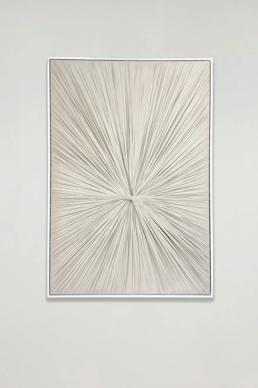 Pieza artística en relieve elaborada sobre lienzo con técnica de yeso, donde una composición radial se despliega desde un punto central, generando una sensación de movimiento orgánico y envolvente.