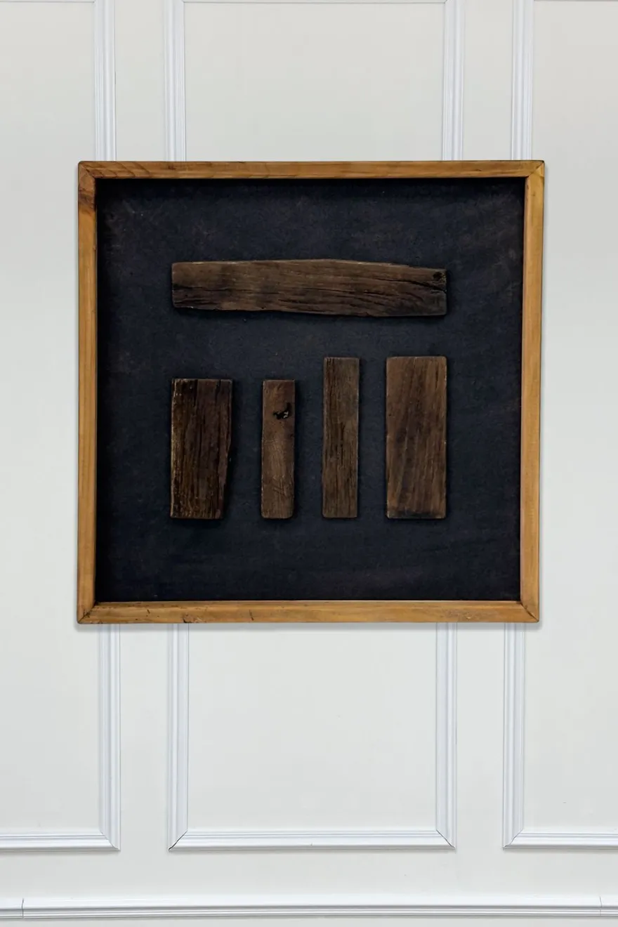 Cuadro decorativo de estilo abstracto compuesto por piezas de madera natural dispuestas de forma horizontal sobre un fondo texturizado. Cada fragmento de madera conserva su forma y veta original, creando una composición orgánica que aporta carácter, calidez y profundidad al espacio.