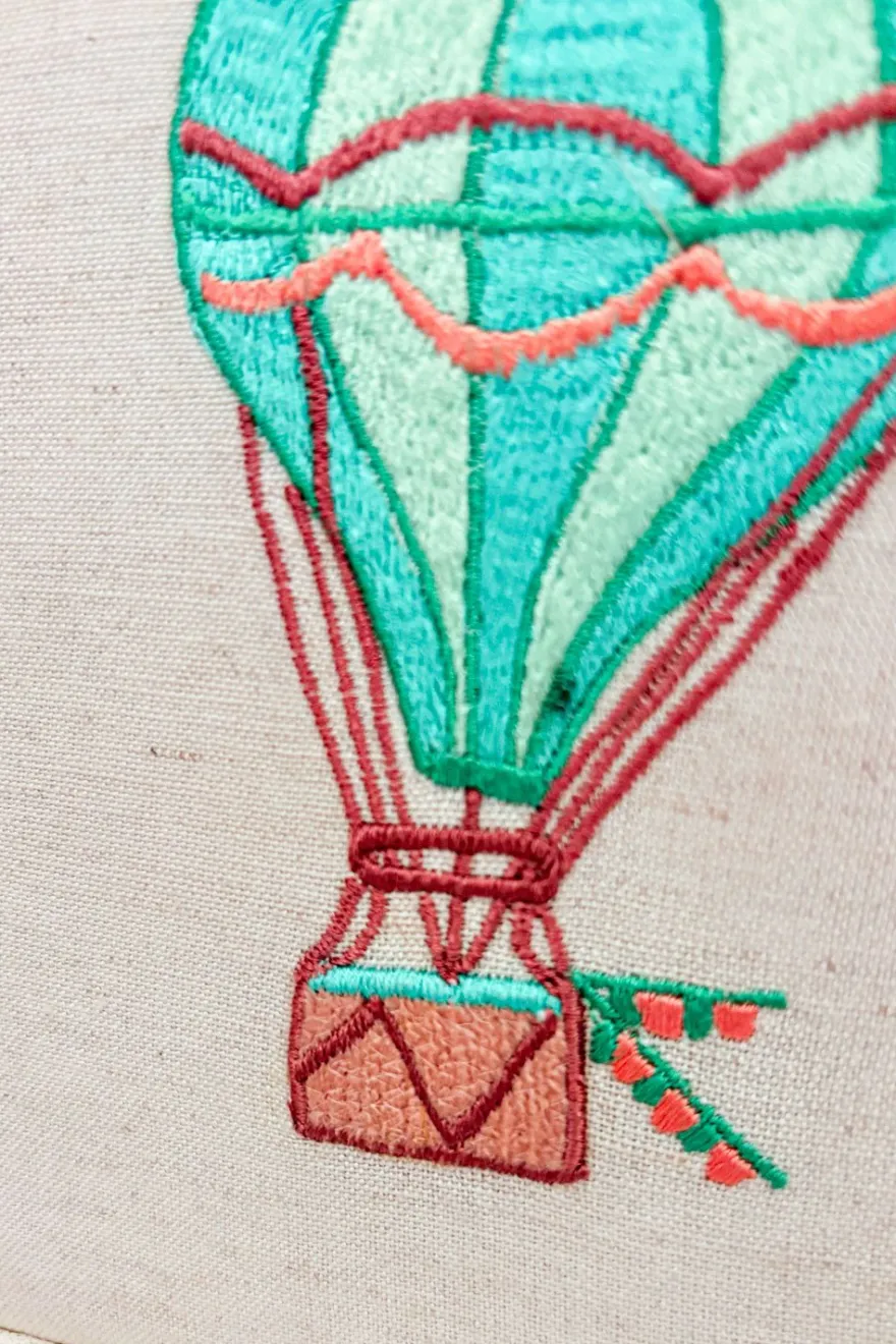 Cuadro infantil bordado con diseño de globo aerostático, ideal para decorar la habitación de los más pequeños de la casa.