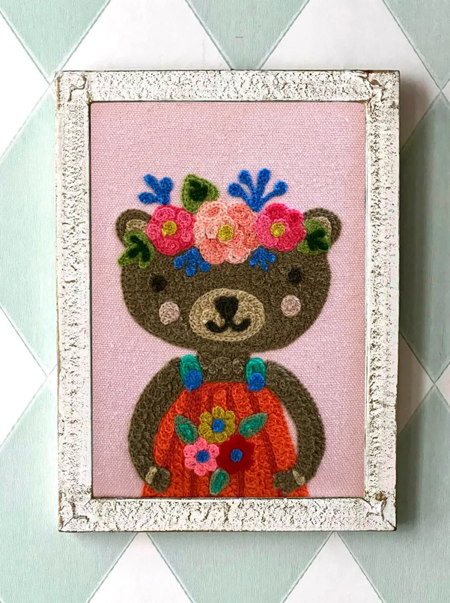 Cuadro infantil bordado con diseño de osa, ideal para decorar la habitación de los más pequeños de la casa.