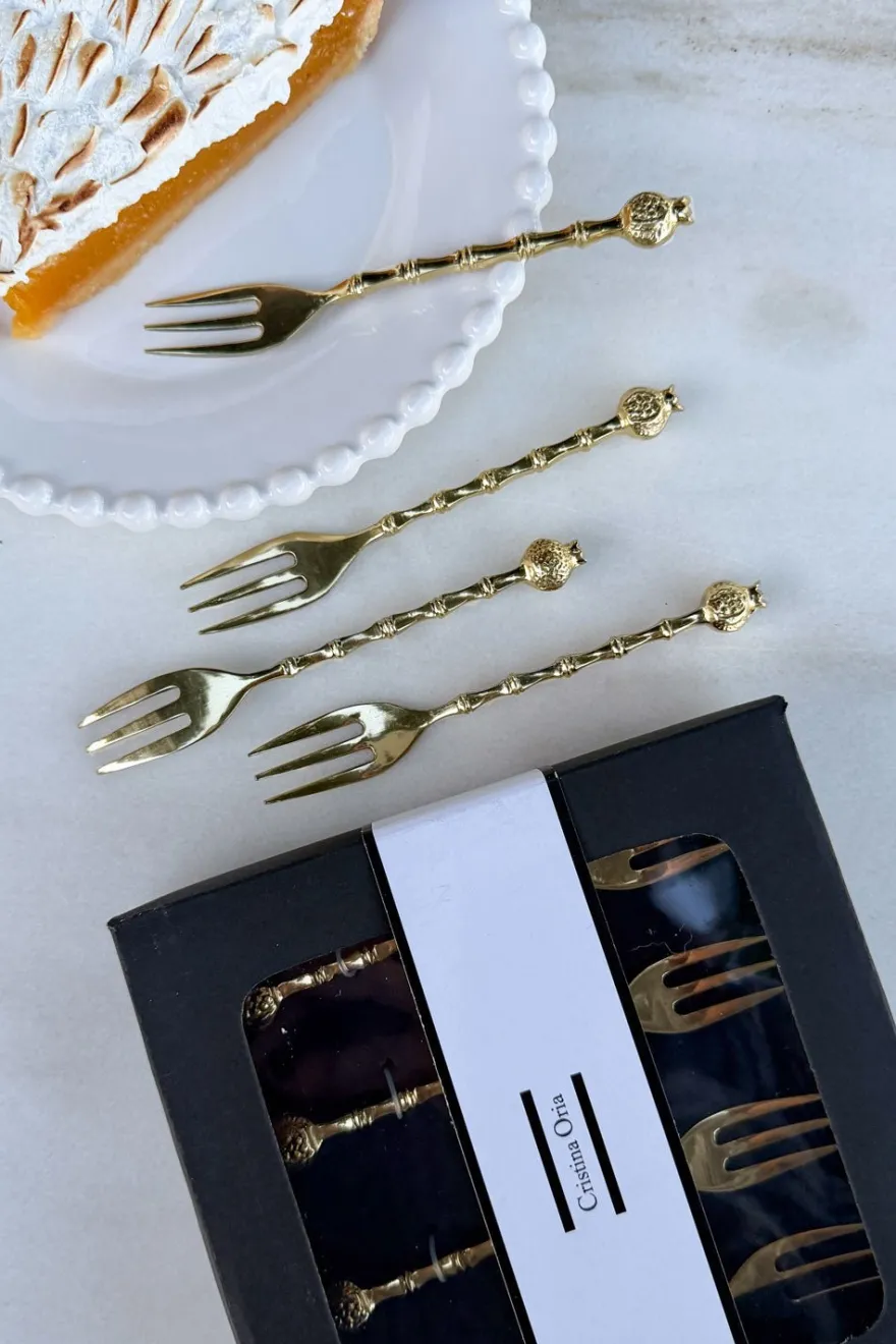 Este elegante set de cuatro tenedores de bronce es el complemento perfecto para cualquier mesa. Cuentan con la figura de una delicada granada en su extremo, lo que los convierte en un regalo único.