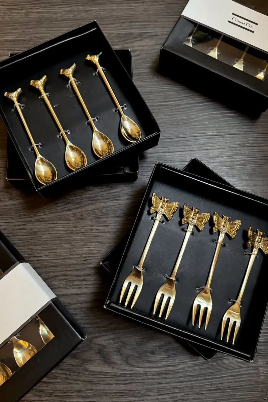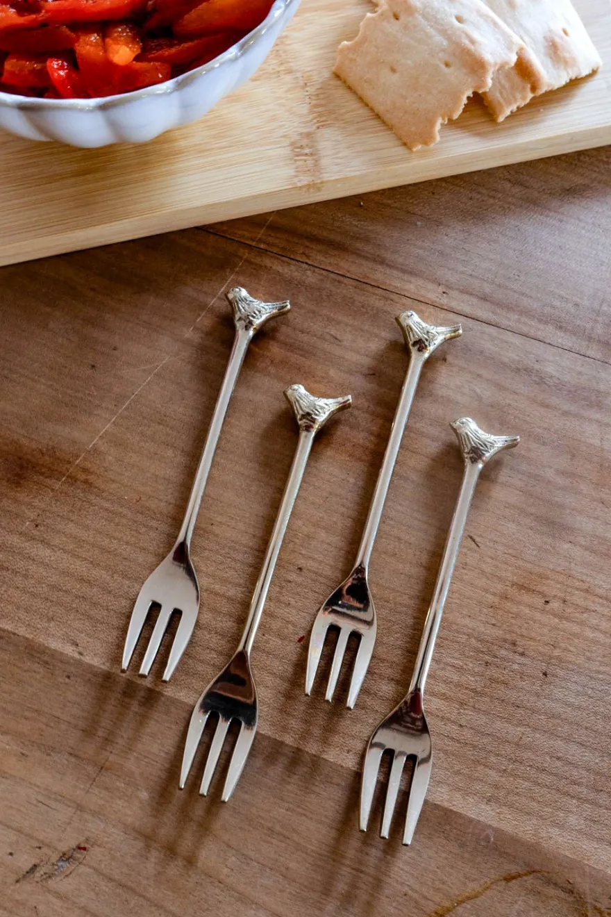 Este elegante set de cuatro tenedores de bronce es el complemento perfecto para cualquier mesa. Cuentan con la figura de un delicado pájaro en su extremo, lo que los convierte en un regalo único.