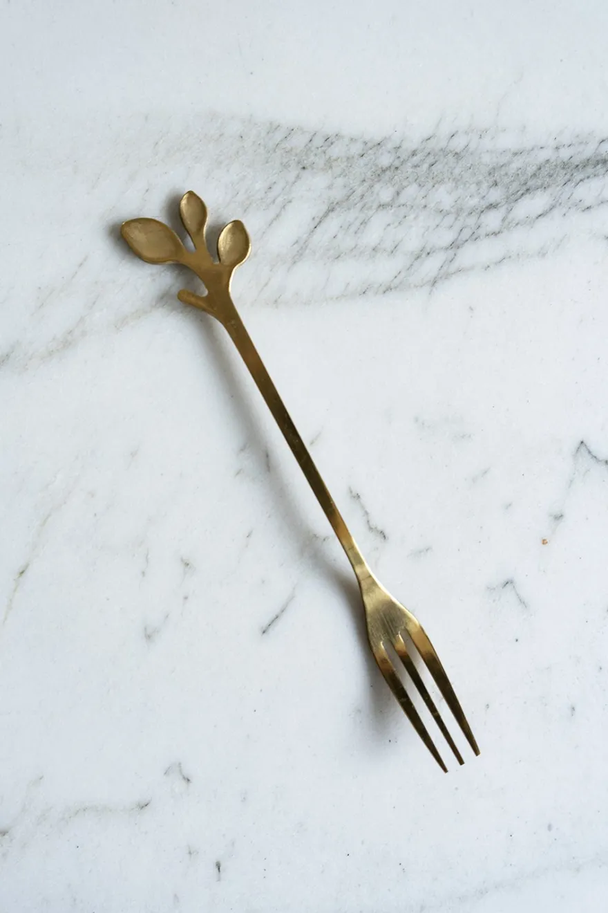 Original juego de cuatro tenedores dorados con diseño de hojas en sus extremos, ideales para aperitivos o postres, y con diseño elegante para vestir las mejores mesas.