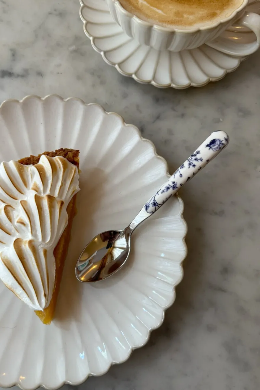 Cucharita de postre con diseño de flores azules, perfecta para complementar tu mesa en desayunos y meriendas.