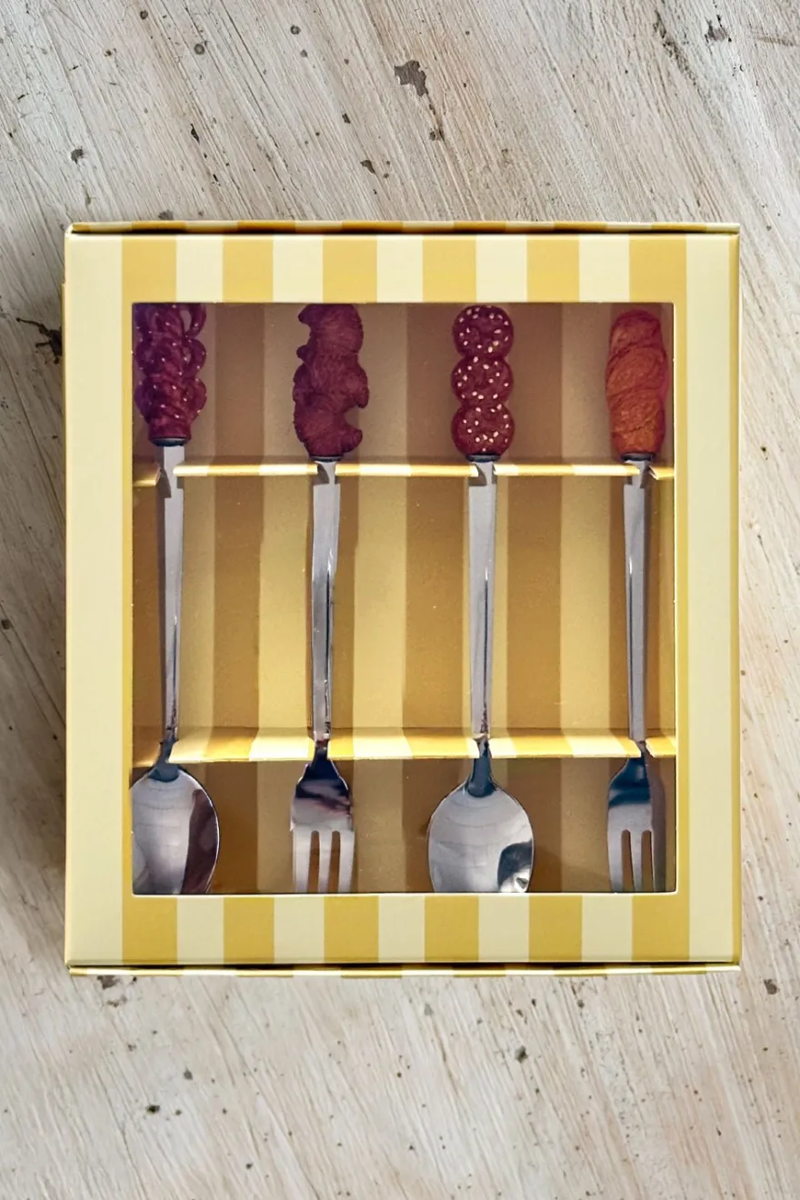 Este set de dos cucharitas y dos tenedores de postre combina originalidad y color. Cada pieza presenta un diseño único, con un delicado dulce en su extremo, ideales para servir postres, cafés o meriendas especiales.